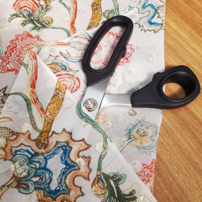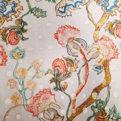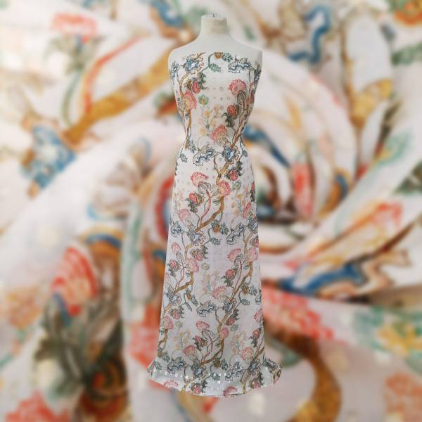 Voile di seta Alta moda fondo avorio, impreziosita da rami e fiori multicolor dai colori rosso, blu zaffiro, verde smeraldo e giallo “ocra”.
