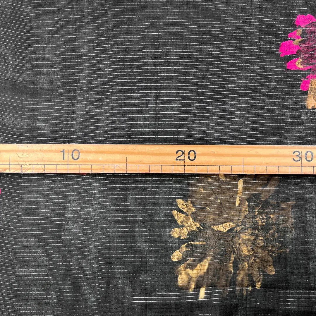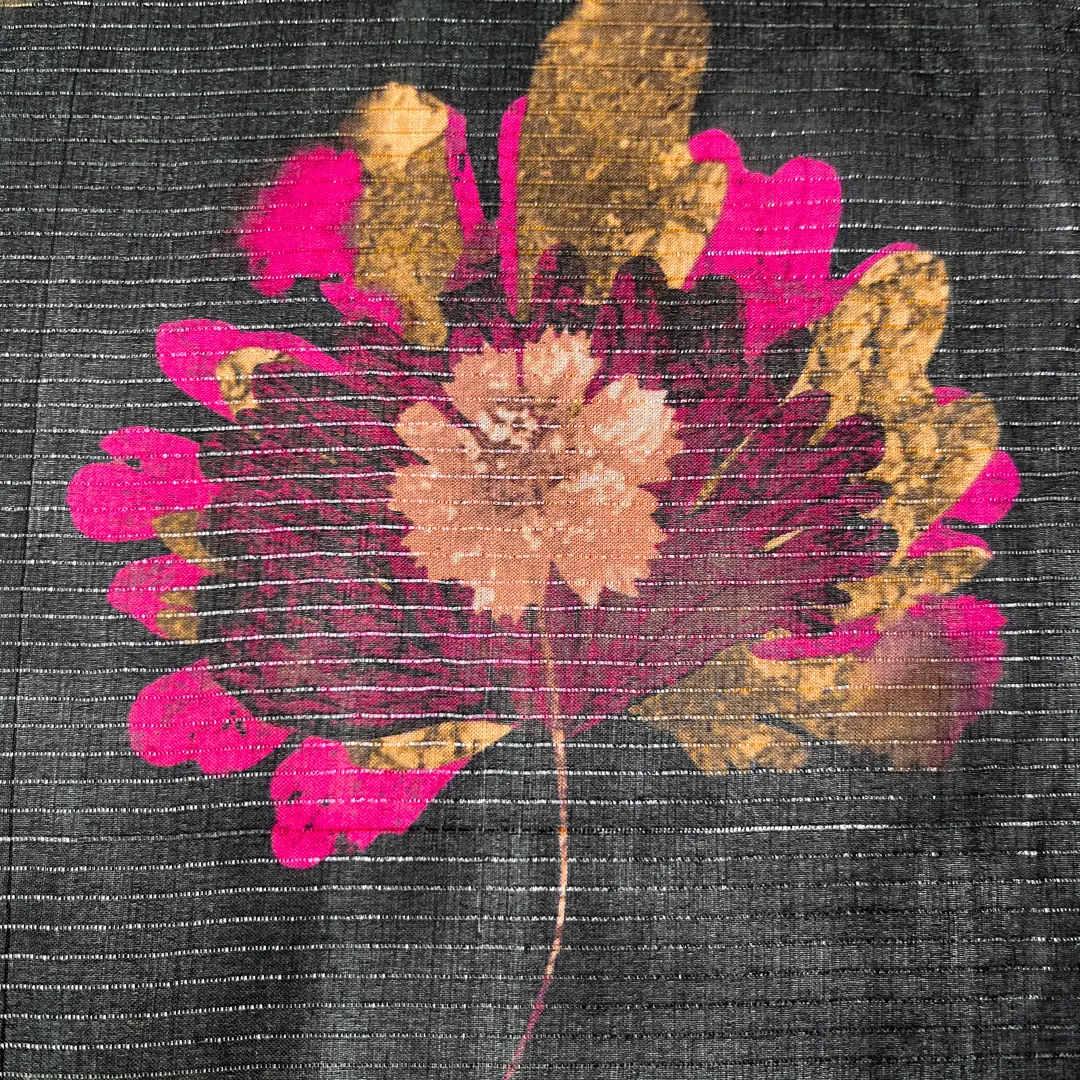 I fiori, disposti con maestria su tutta la superficie del voile, sono dipinti con tonalità che variano dal rosa acceso al rosa pallido, e si mescolano con accenti dorati e bronzei.