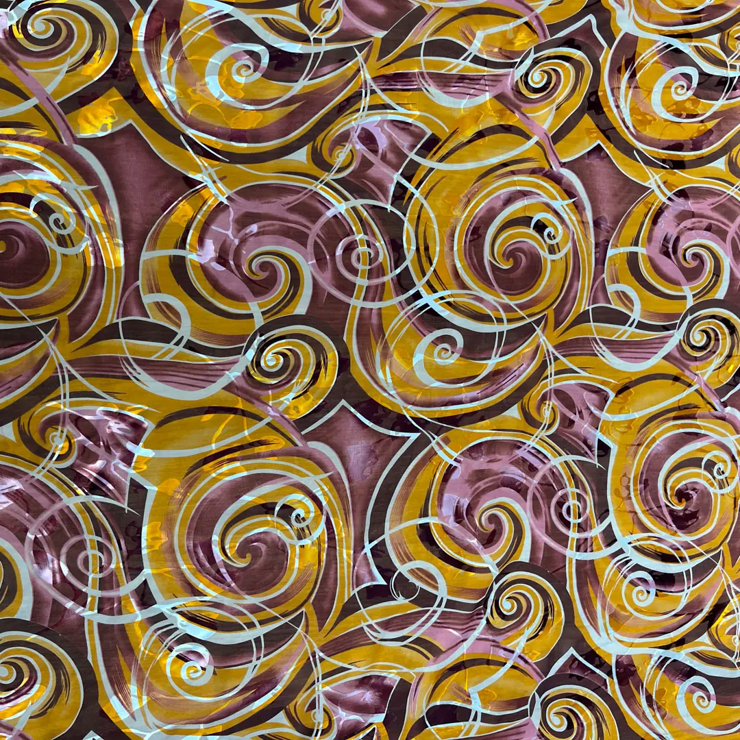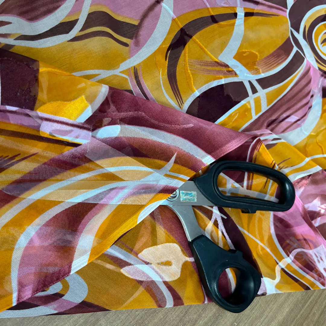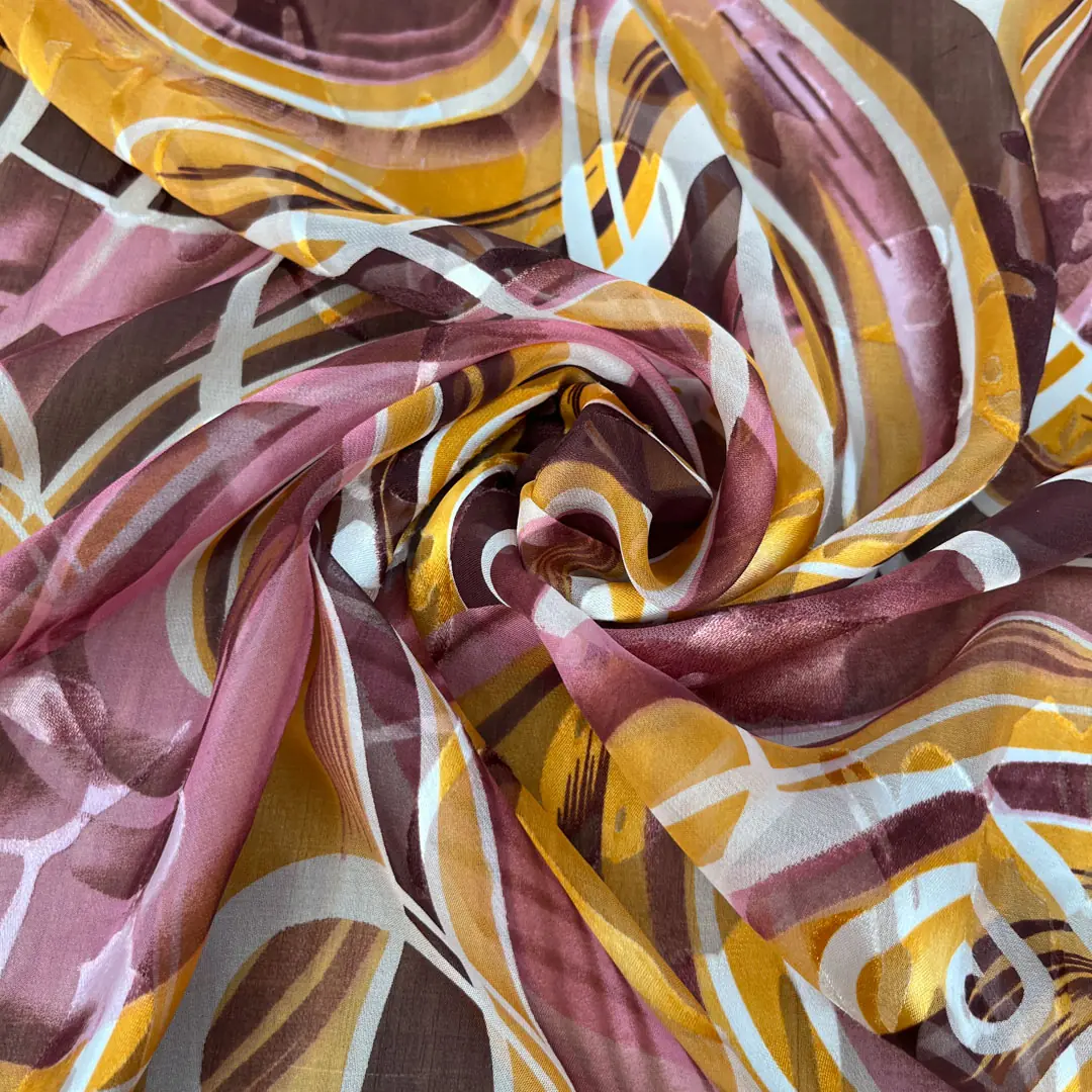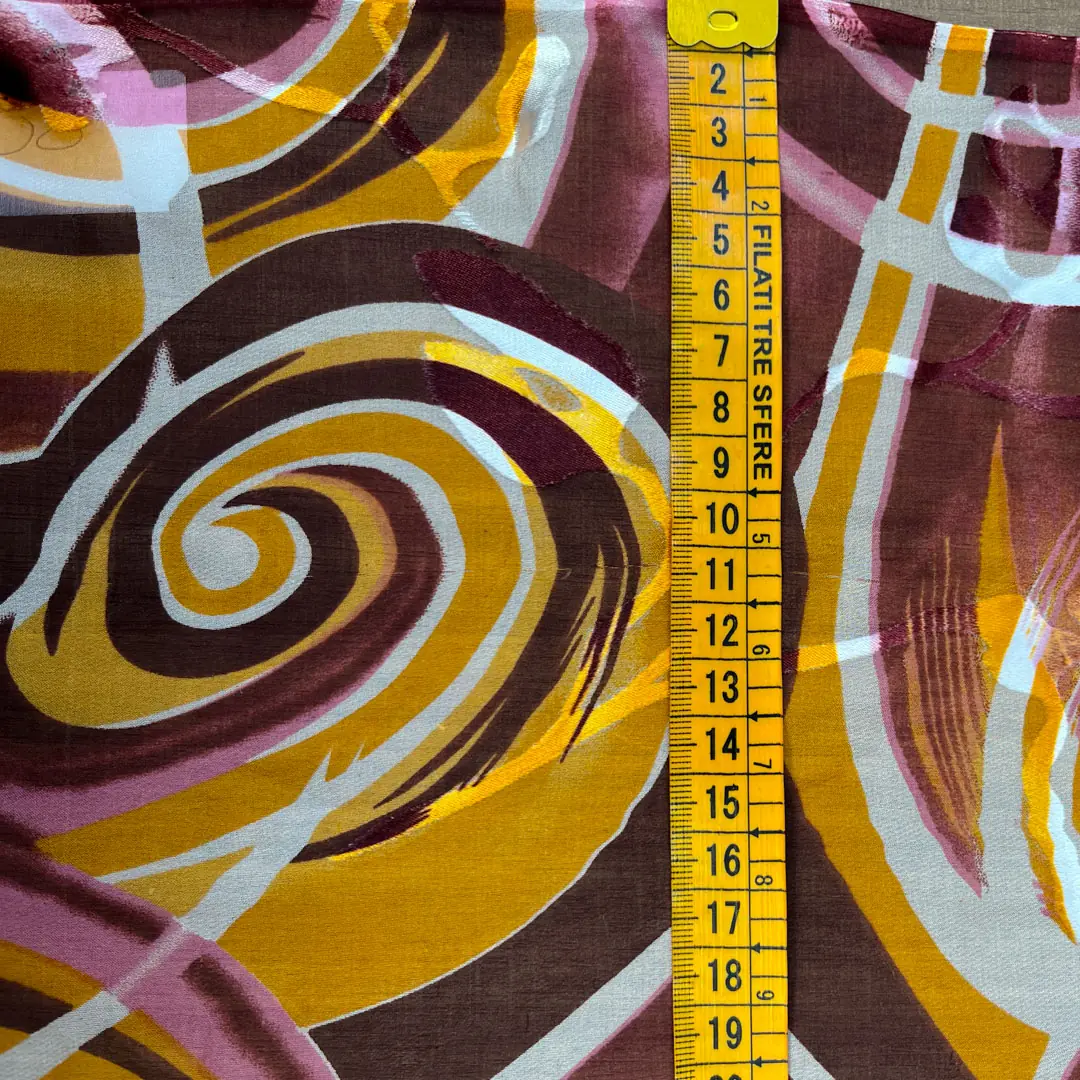 Ciò che rende questo voile davvero unico è la sua fantasia cromatica: un’esplosione di colori vivaci e brillanti, che spaziano da un giallo lucente a un fucsia intenso, passando per il bianco puro fino ad arrivare a un elegante e profondo bordeaux. Queste tonalità, sapientemente distribuite in un pattern dinamico e creativo, conferiscono alla stoffa un’anima eccentrica e gioiosa, perfetta per chi desidera distinguersi con stile.