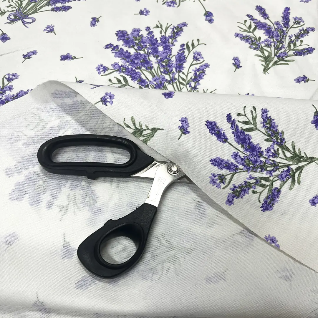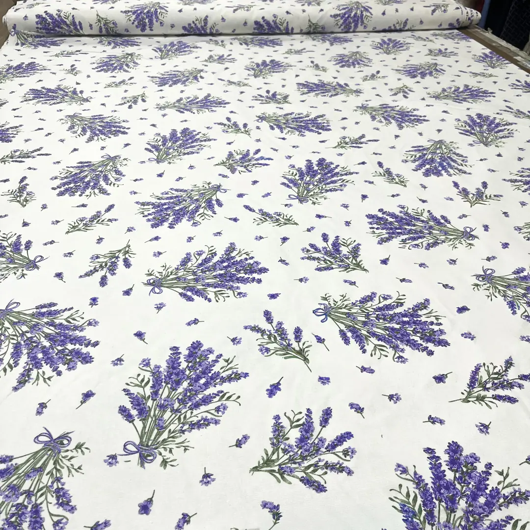 Panama 100% cotone naturale con fantasia floreale di lavanda che rappresenta un tessuto ideale per il tovagliato, grazie alla sua trama panama aperta e grana più grossa rispetto alla classica tela, che conferisce compattezza, resistenza ai lavaggi frequenti e una mano morbida e rustica al tatto.