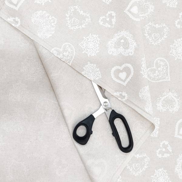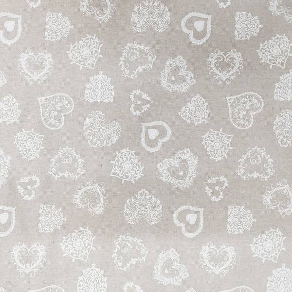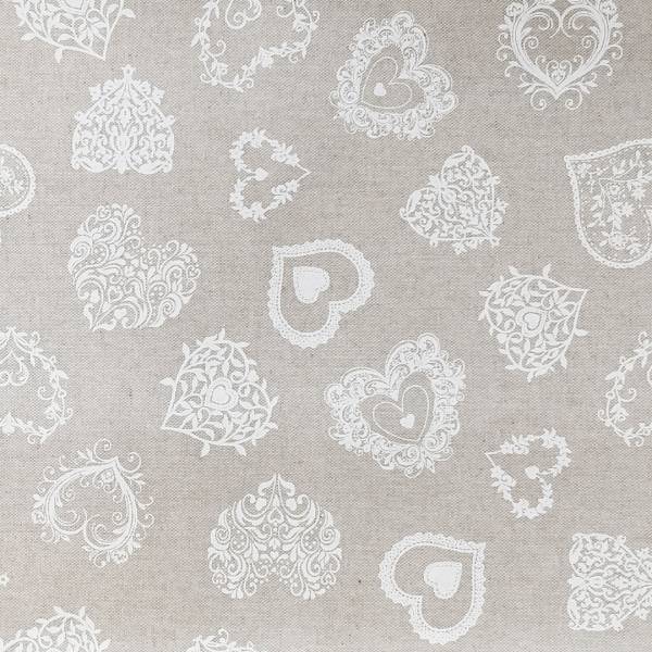 Tessuto arredamento con tramatura di panama di alta qualità con base di colore neutro corda e disegni a contrasto bianchi, fantasia amore.