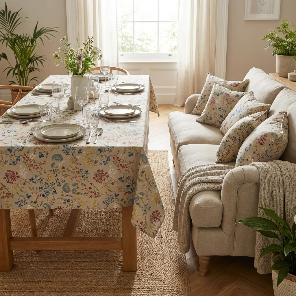 Il disegno fitto aiuta a mascherare eventuali piccole macchie o segni d’uso, rendendo questo tessuto d’arredo una scelta pratica per ristoranti, agriturismi e B&B oltre che per l’uso domestico, dove può diventare il protagonista di una tavola e di una casa accogliente e colorata in ogni stagione.