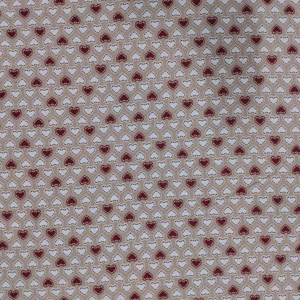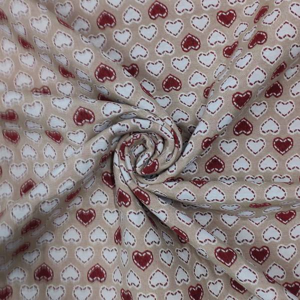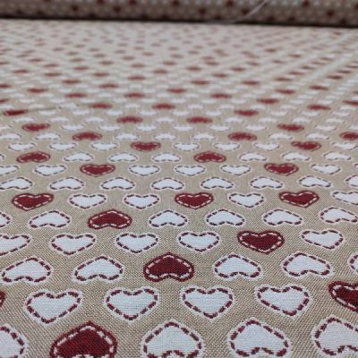 Tessuto amore in gobelin è un Tessuto con fantasia di decorazioni a cuori con colori natalizi, lo sfondo è color tortora che è in contrasto con i cuori rossi e bianchi.
