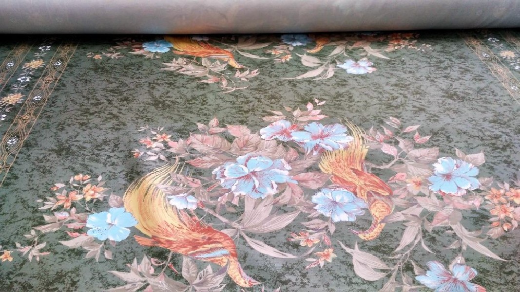 Lateralmente, due fasce ispirate allo stile Rococò concludono come in una cornice d’altri tempi lo sfondo, che spicca per il suo verde antico a effetto intonaco spatolato. Al centro, quasi una danza di colori e figure, alcuni volatili fanno capolino tra leggerissimi fiori di ibisco.