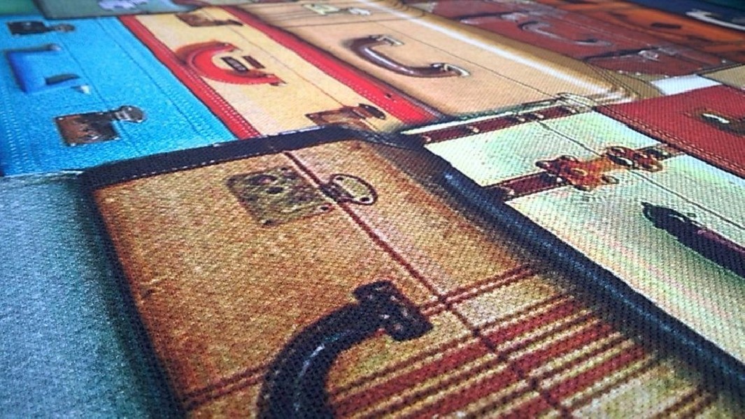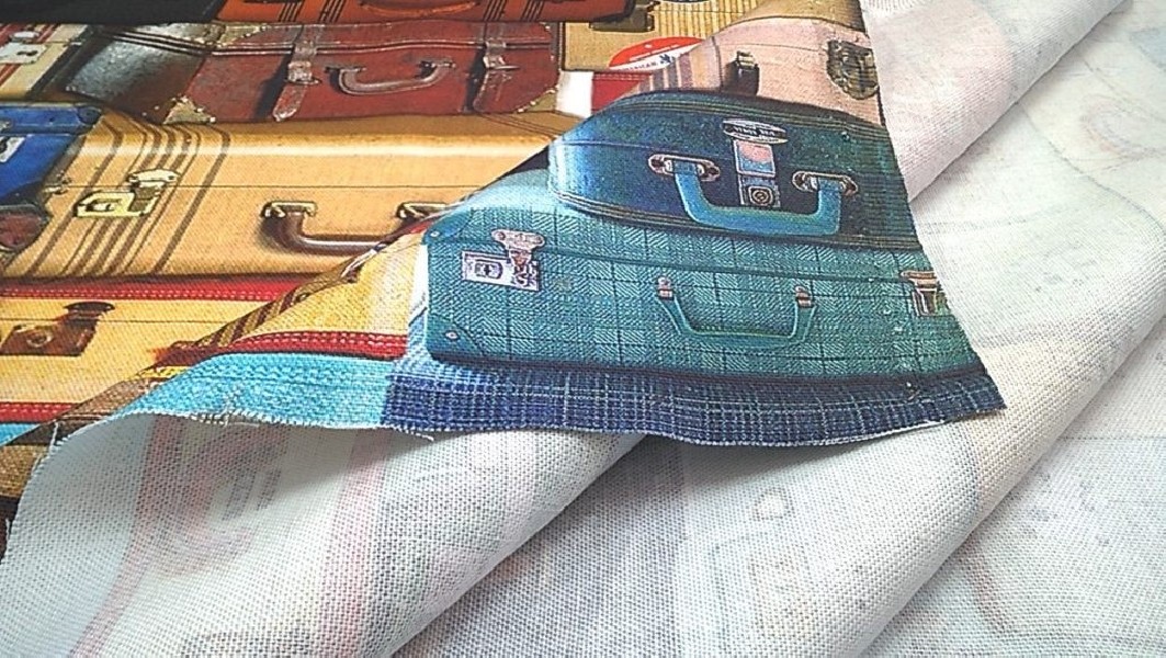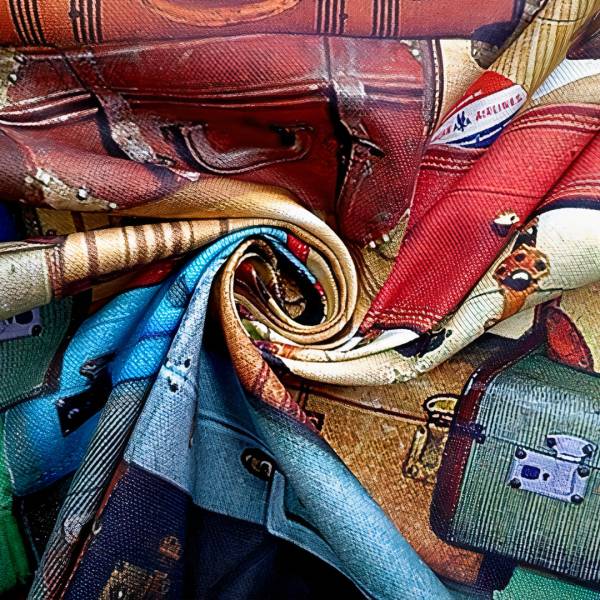 Tessuto in Puro Cotone a fantasia con valigie in vari colori. Ideale per un arredamento moderno ed eccentrico.
