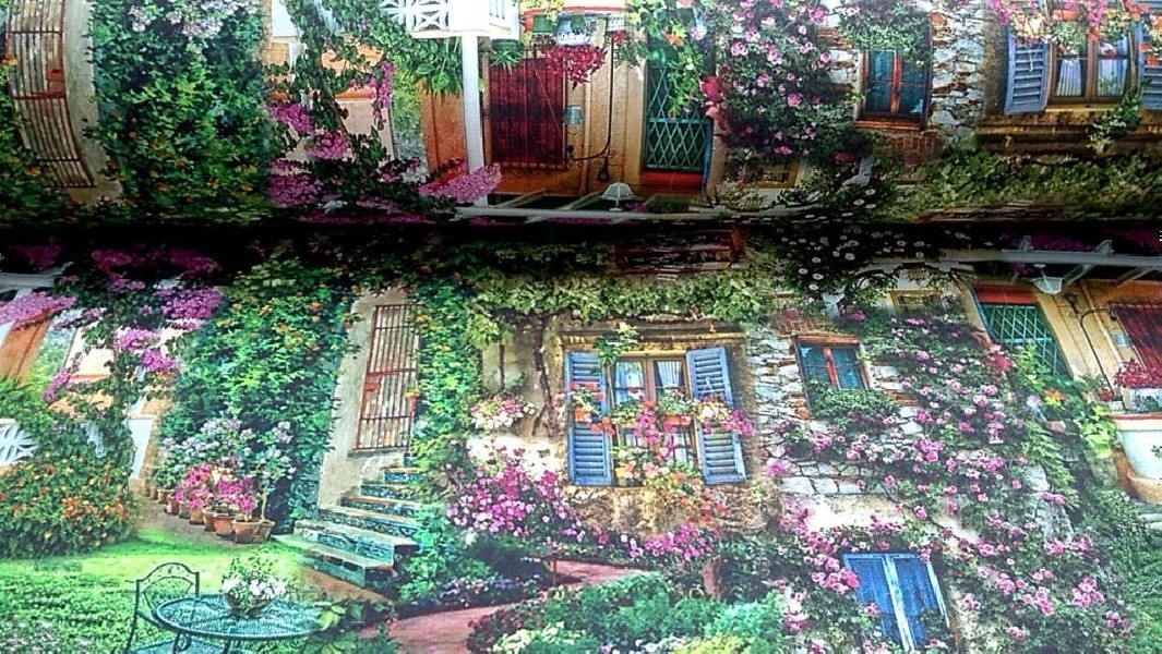 Tessuto in Puro Cotone a fantasia con paesaggi di giardini in tonalità naturali. Ideale per un arredamento moderno ed eccentrico.