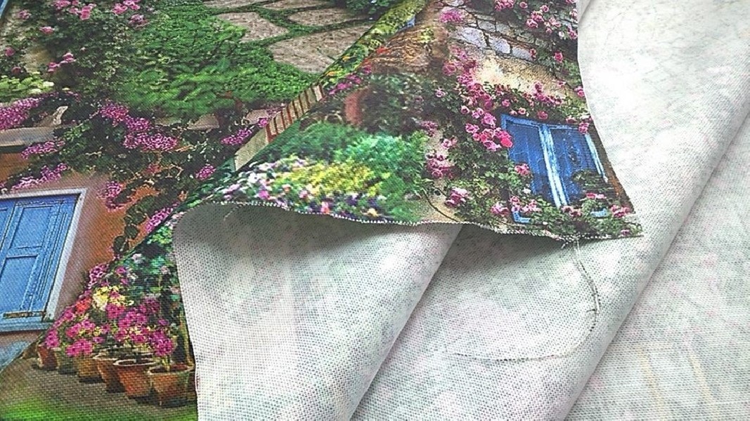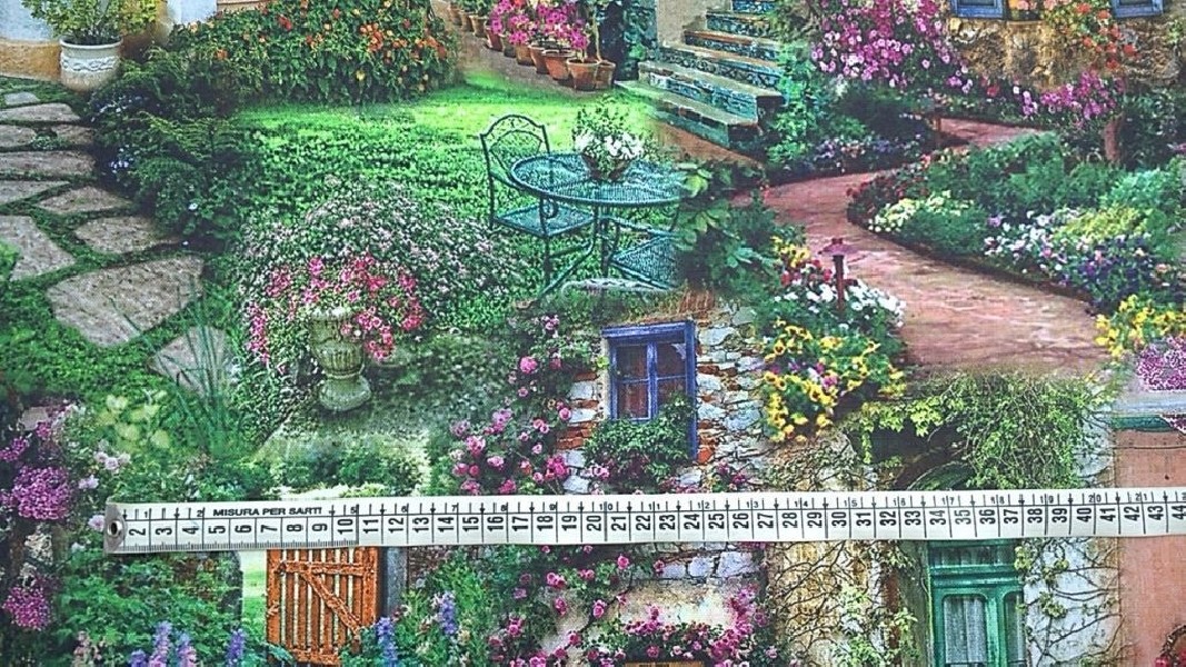 Tessuto in Puro Cotone a fantasia con paesaggi di giardini in tonalità naturali.