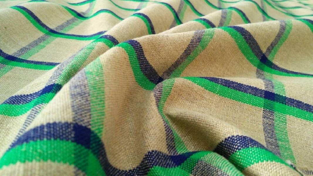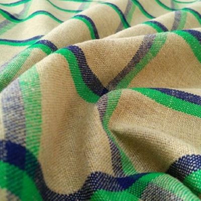 Tessuto in cotone color sabbia con fantasia a righe blu elettrico scuro e verde acceso