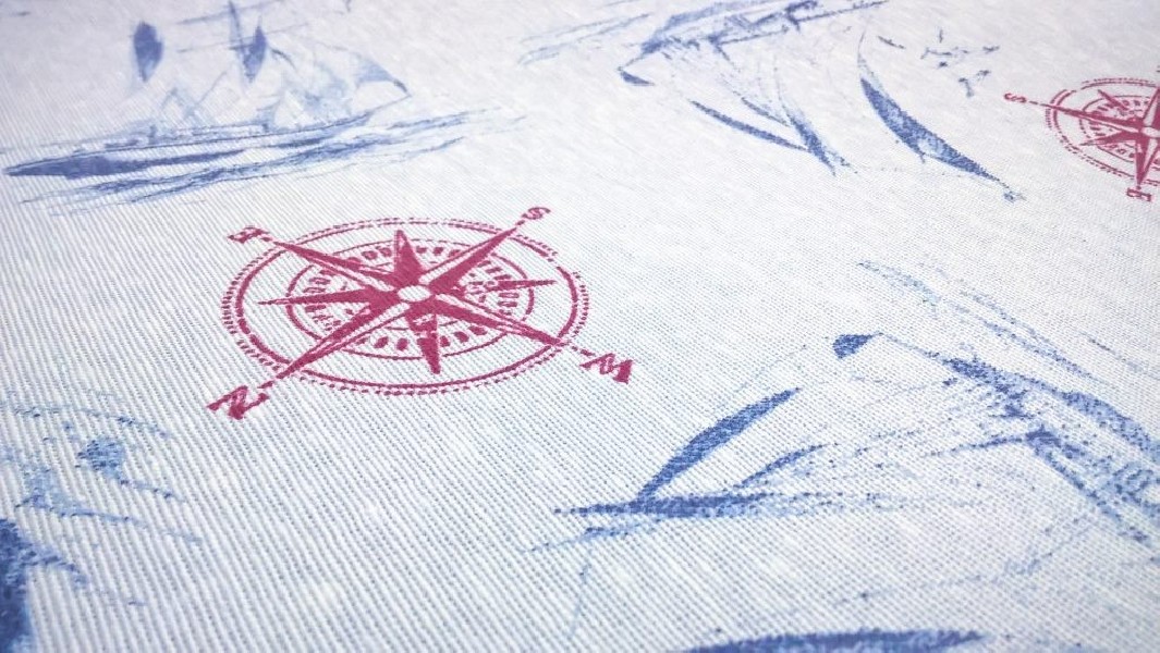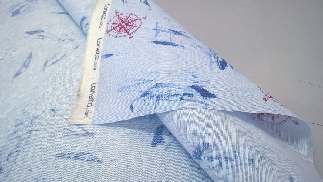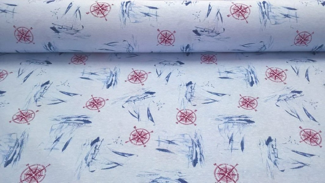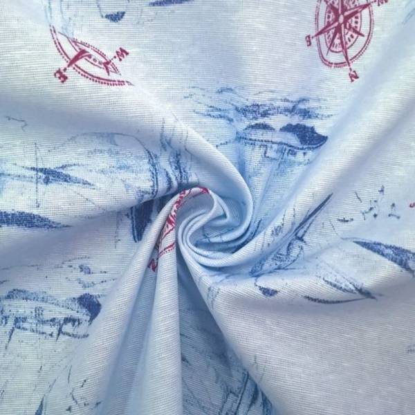 Tessuto in Misto Cotone a tema marinaro su sfondo azzurro chiaro, con stampate barche blu e rose dei venti in rosso.
