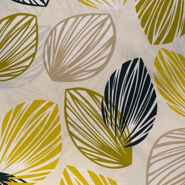 Grazie all’altezza doppia da 280 cm, questo tessuto d’arredo foglie dorate su sfondo panna permette di progettare confezioni anche di grandi dimensioni – tende per portefinestre, pannelli a tutta altezza, copriletti, tovaglie o copritavolo coordinati – riducendo le cuciture e gli scarti. La fantasia botanica contemporanea, nei toni caldi dell’oro su base panna, si abbina facilmente a mobili in legno naturale, laccati bianchi o finiture metalliche dorate, creando un filo conduttore tra tessili e arredo.