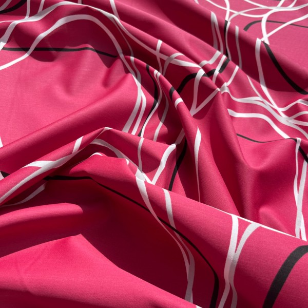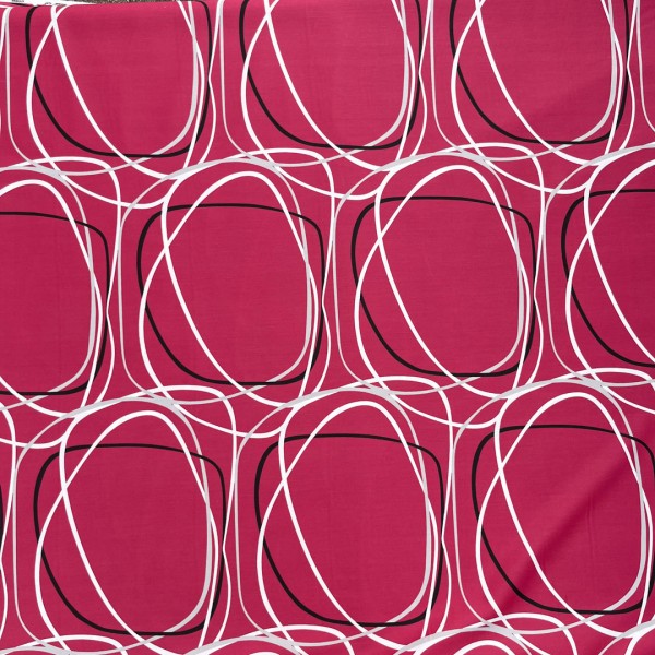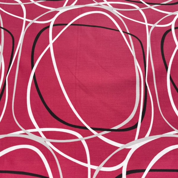 Le curve bianche e nere che si intrecciano sul tessuto formano una serie di figure tonde irregolari che conferiscono al tessuto un design unico e dinamico.