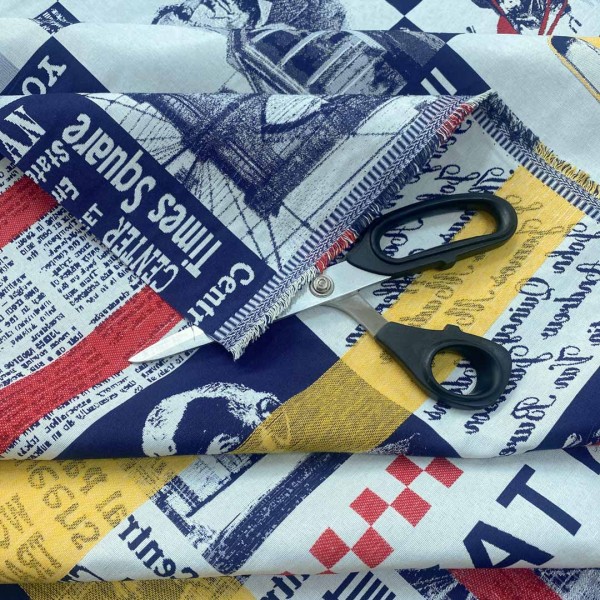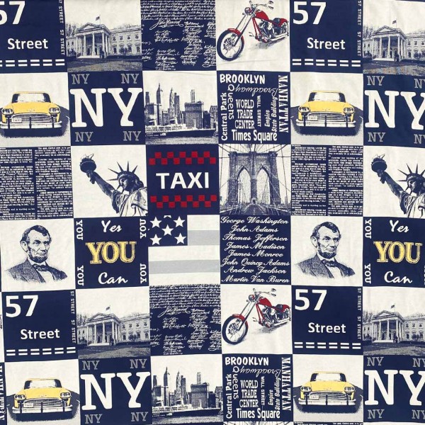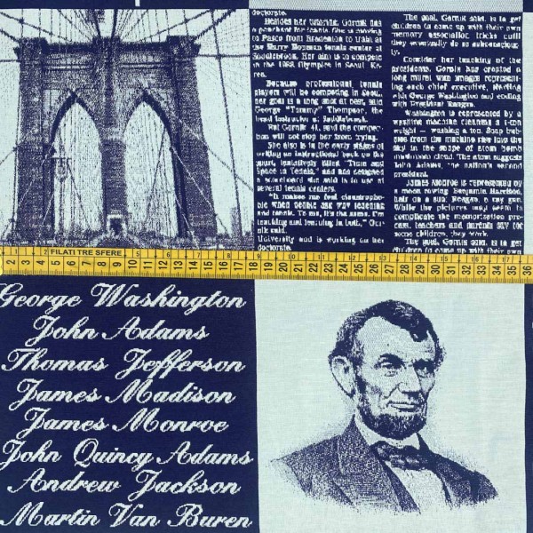 Originale tessuto da arredo con fantasia che ritrae svariati elementi iconici della cultura americana come Lincoln, la statua della libertà, la Casa Bianca etc. I colori variano dal blu scuro al giallo acceso, mentre lo sfondo è color bianco naturale.