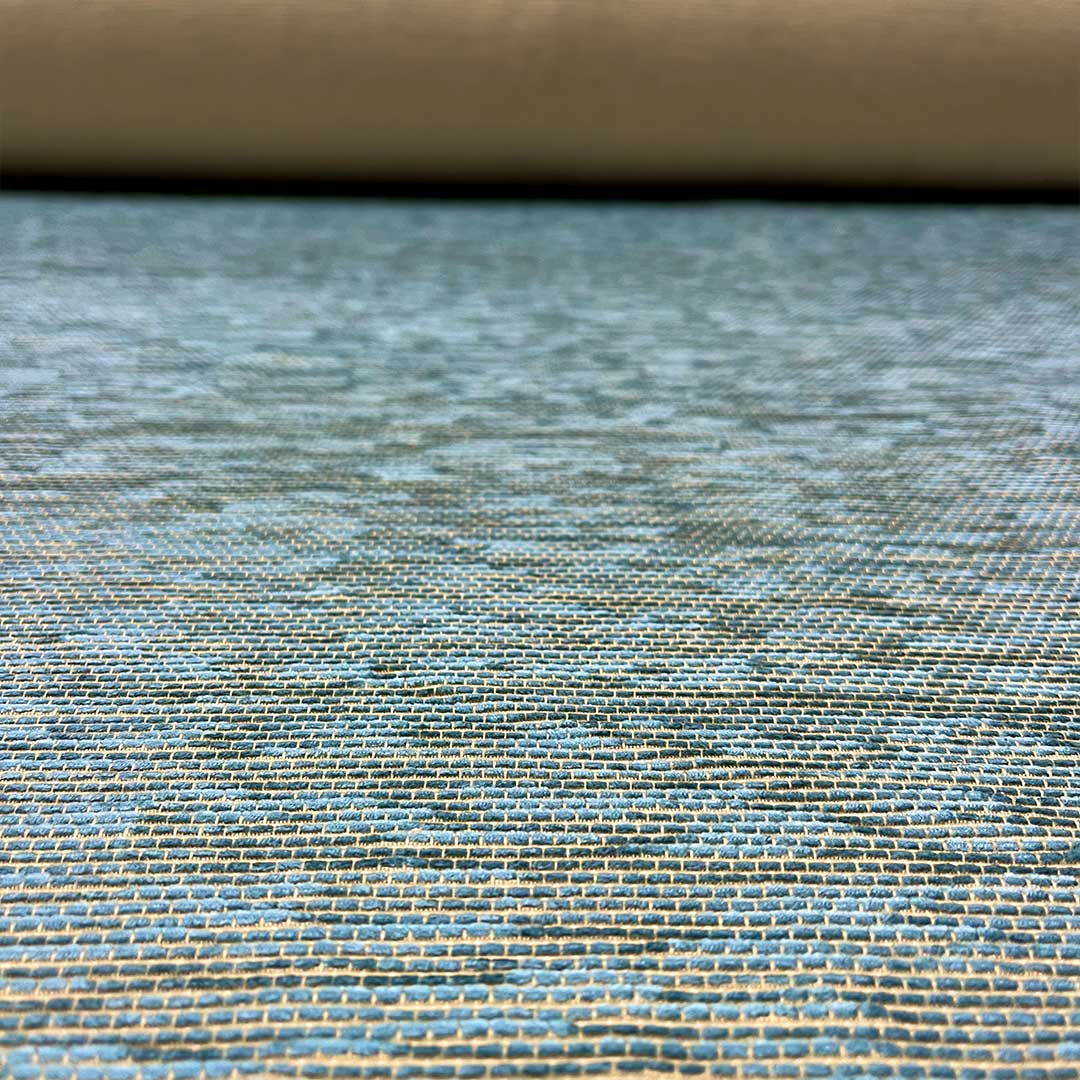 La caratteristica distintiva di questo tessuto è la trama in rilievo di fili cinigliati celesti a forma di piccoli rettangoli, che aggiungono una nota di vivacità e originalità al design complessivo.