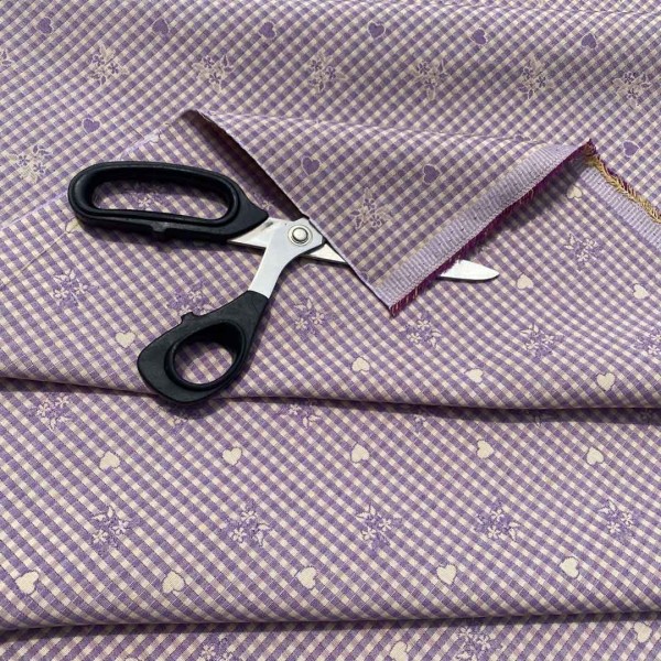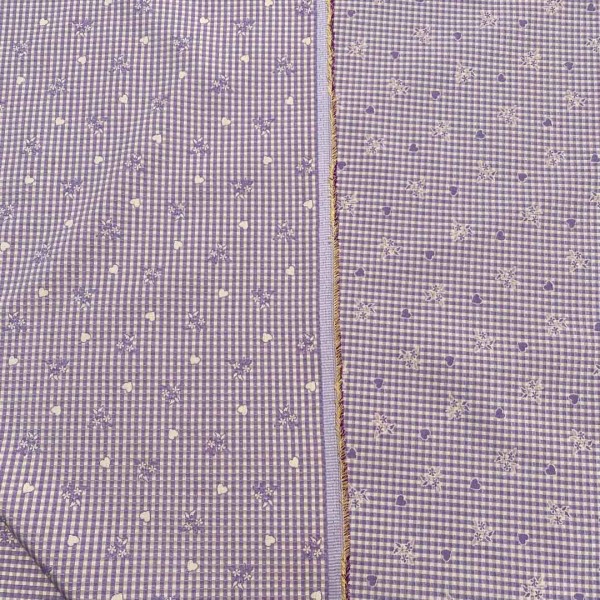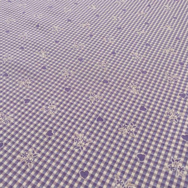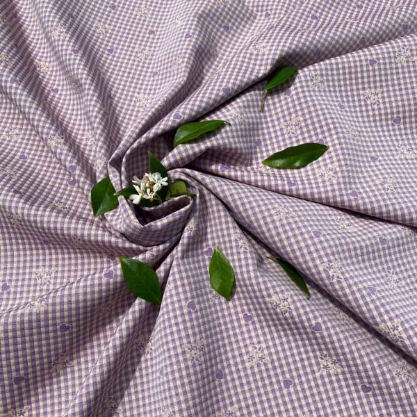 Il tessuto presenta una fantasia senza tempo con elementi floreali e cuoricini su una base a quadretti bianchi e lilla.
