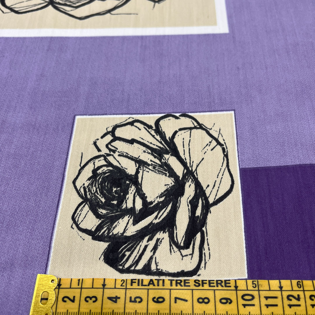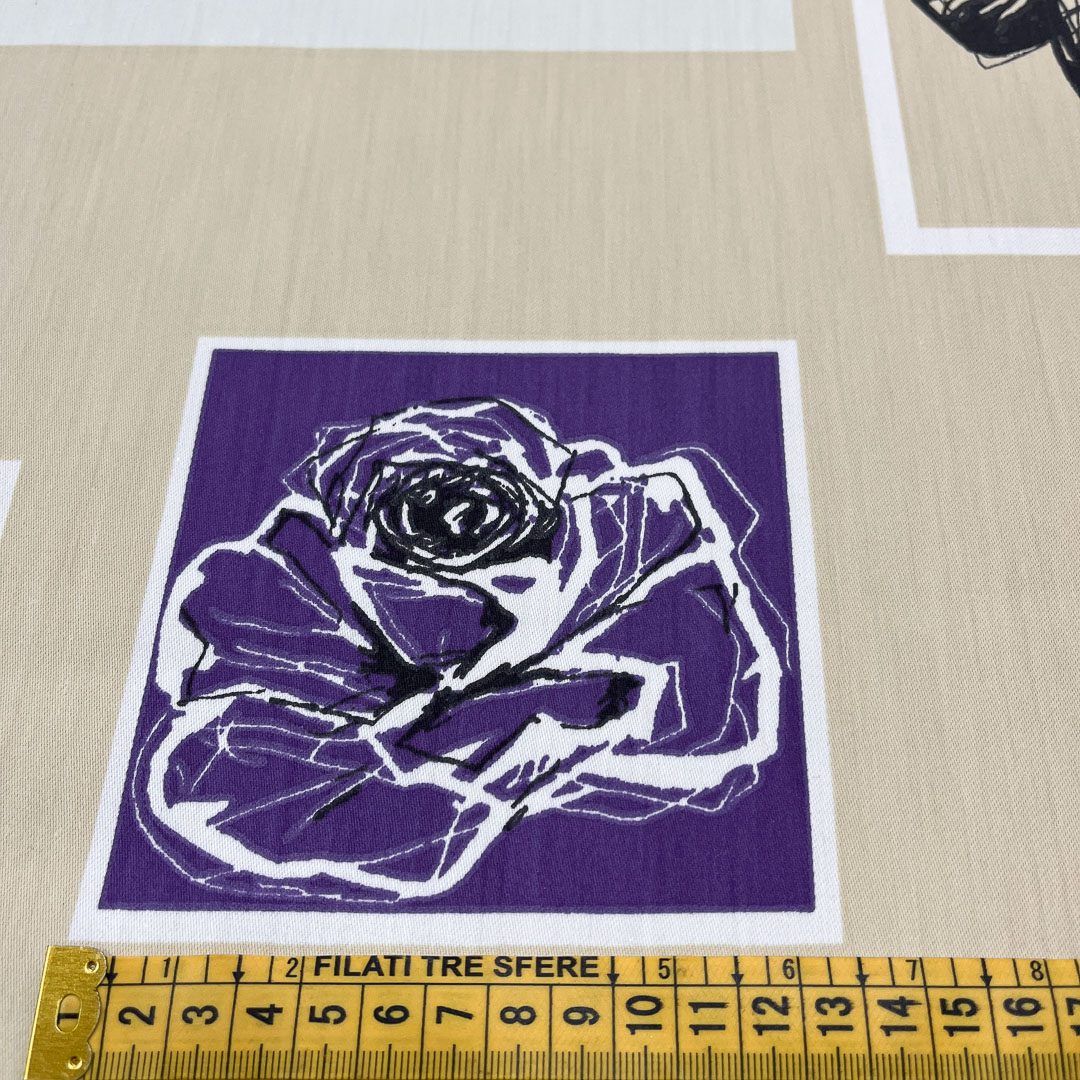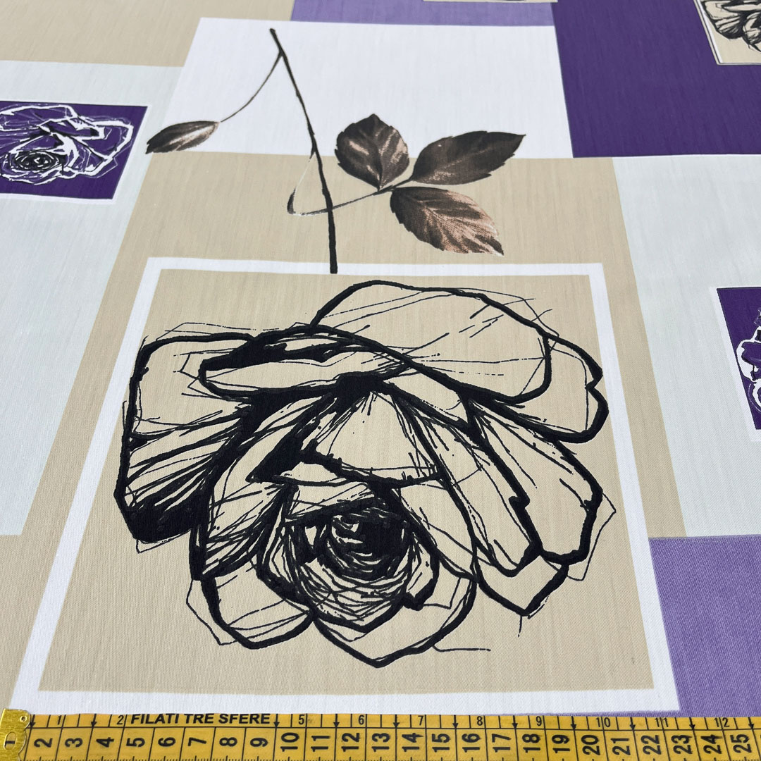 Tessuto con rose disegnate su base geometrica asimmetrica