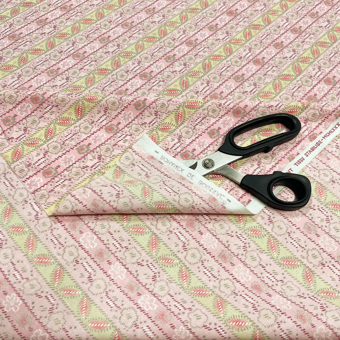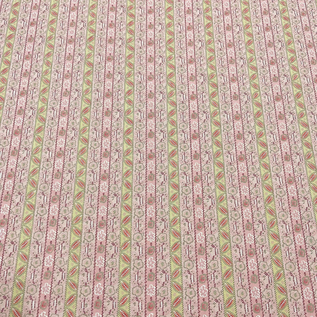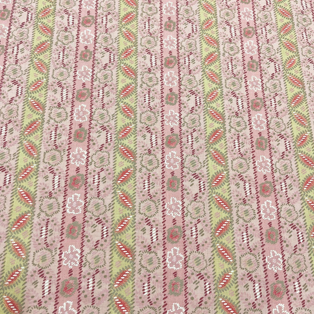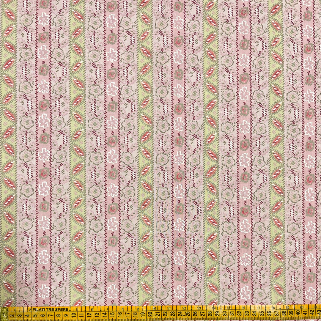 Tessuto in Puro Cotone a fantasia nei colori rosa chiaro, intenso, verde e arancione.