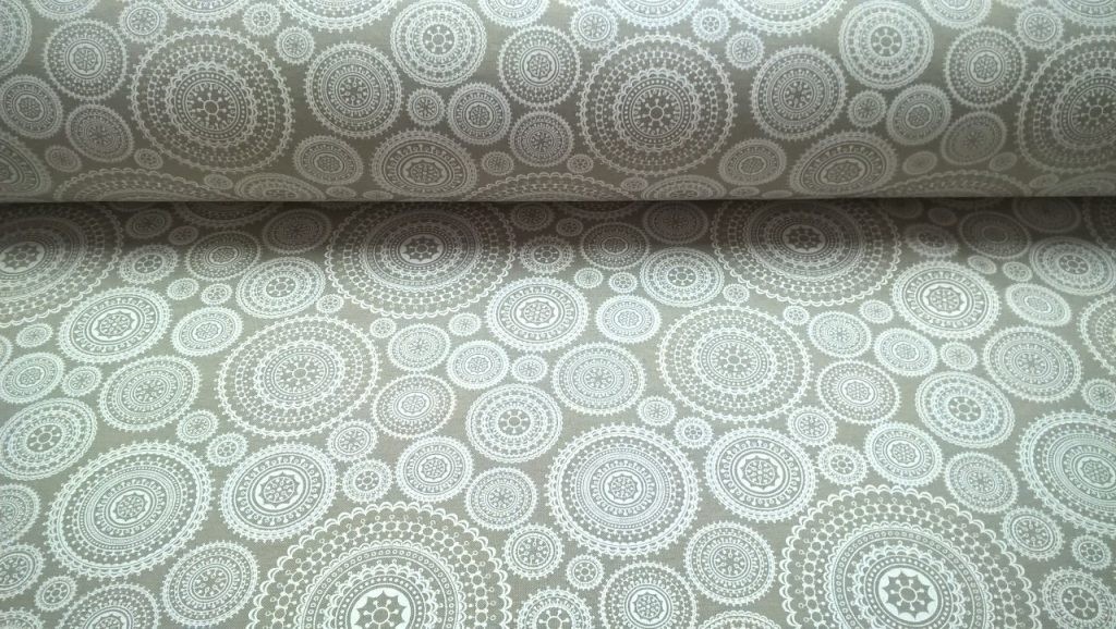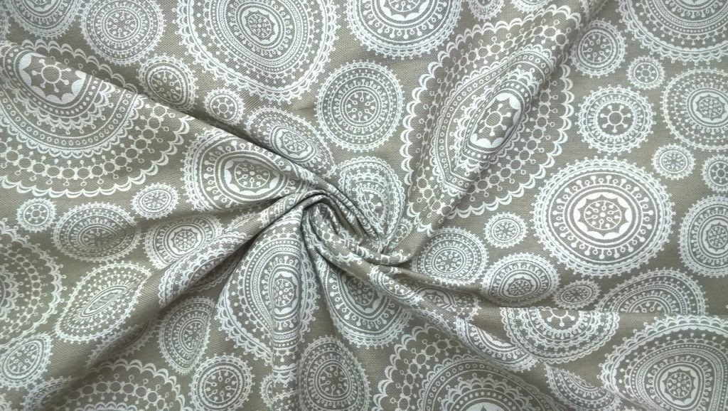 Tessuto in puro Cotone a sfondo Ecru con fantasia geometrica in colore bianco.
