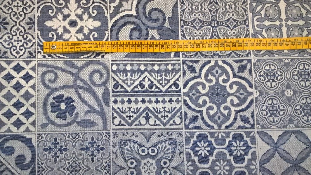 Tessuto in Misto Cotone a fantasia geometrica nei colori blu e bianco effetto maiolica.