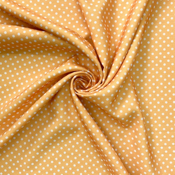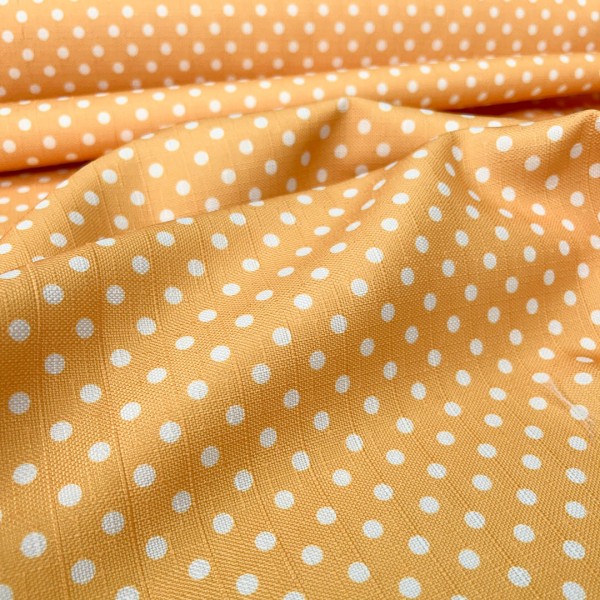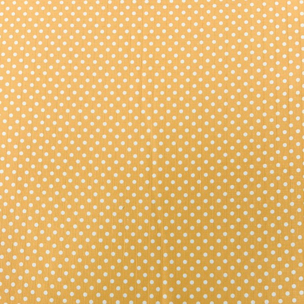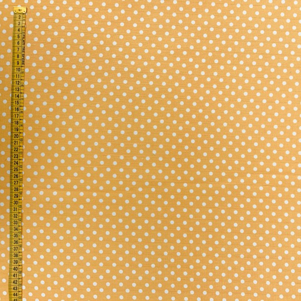 La tonalità giallo ambra di questo tessuto evoca un senso di vitalità e ottimismo, mentre i pois bianchi creano un effetto visivo giocoso. Utilizza questo tessuto per illuminare il tuo arredamento e creare una atmosfera accogliente.