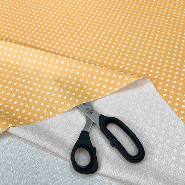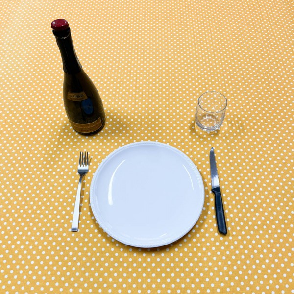 Tessuto da arredamento e tovaglie pois bianco su sfondo giallo
