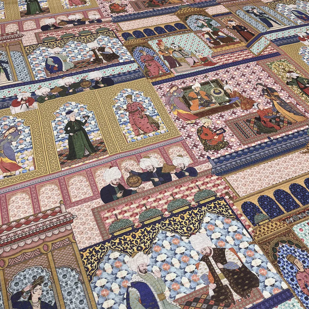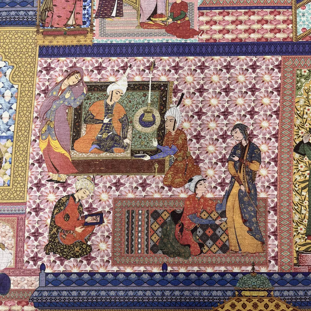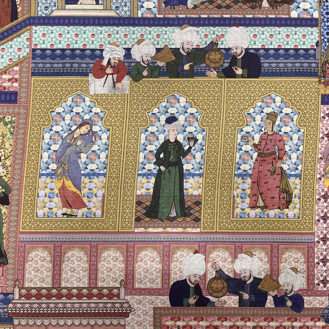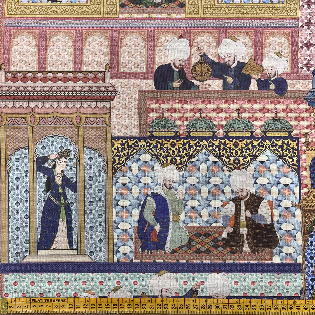 La fantasia si ispira all’arte islamica, caratterizzata da architetture con archi a ferro di cavallo e raffinati motivi geometrici. Il disegno è arricchito da figure umane in abiti tradizionali e copricapi, immerse in scene di vita quotidiana, come conversazioni, momenti di riposo e attività artigianali. I colori vivaci e i dettagli decorativi donano al tessuto un fascino unico, creando un’atmosfera ricca e suggestiva.