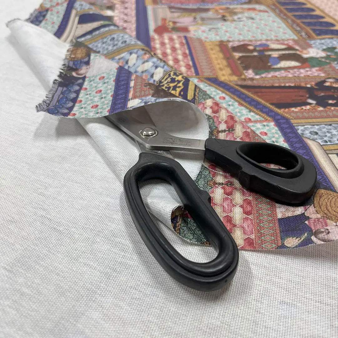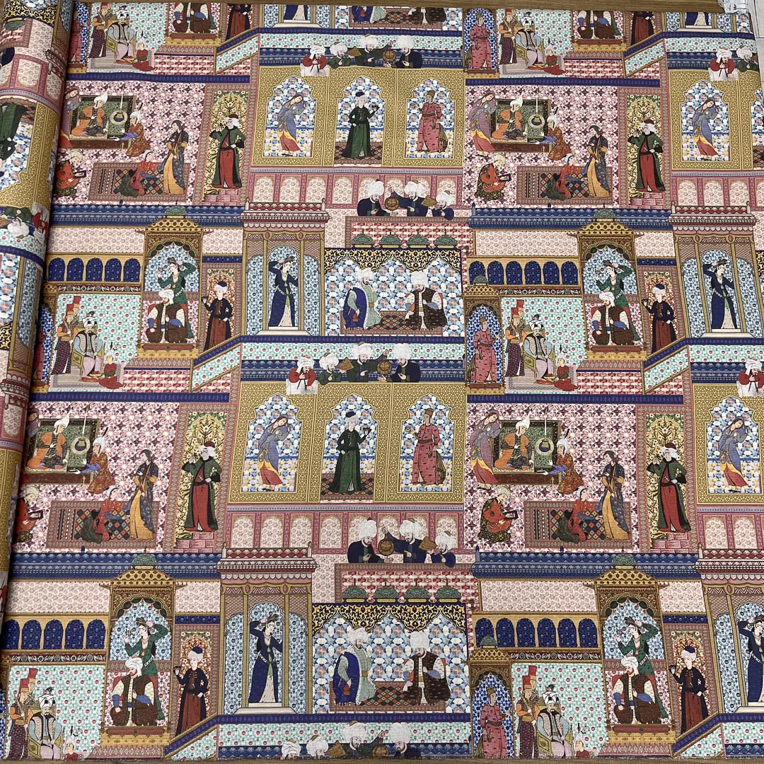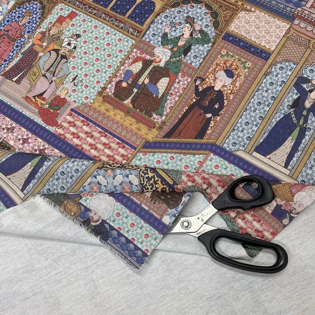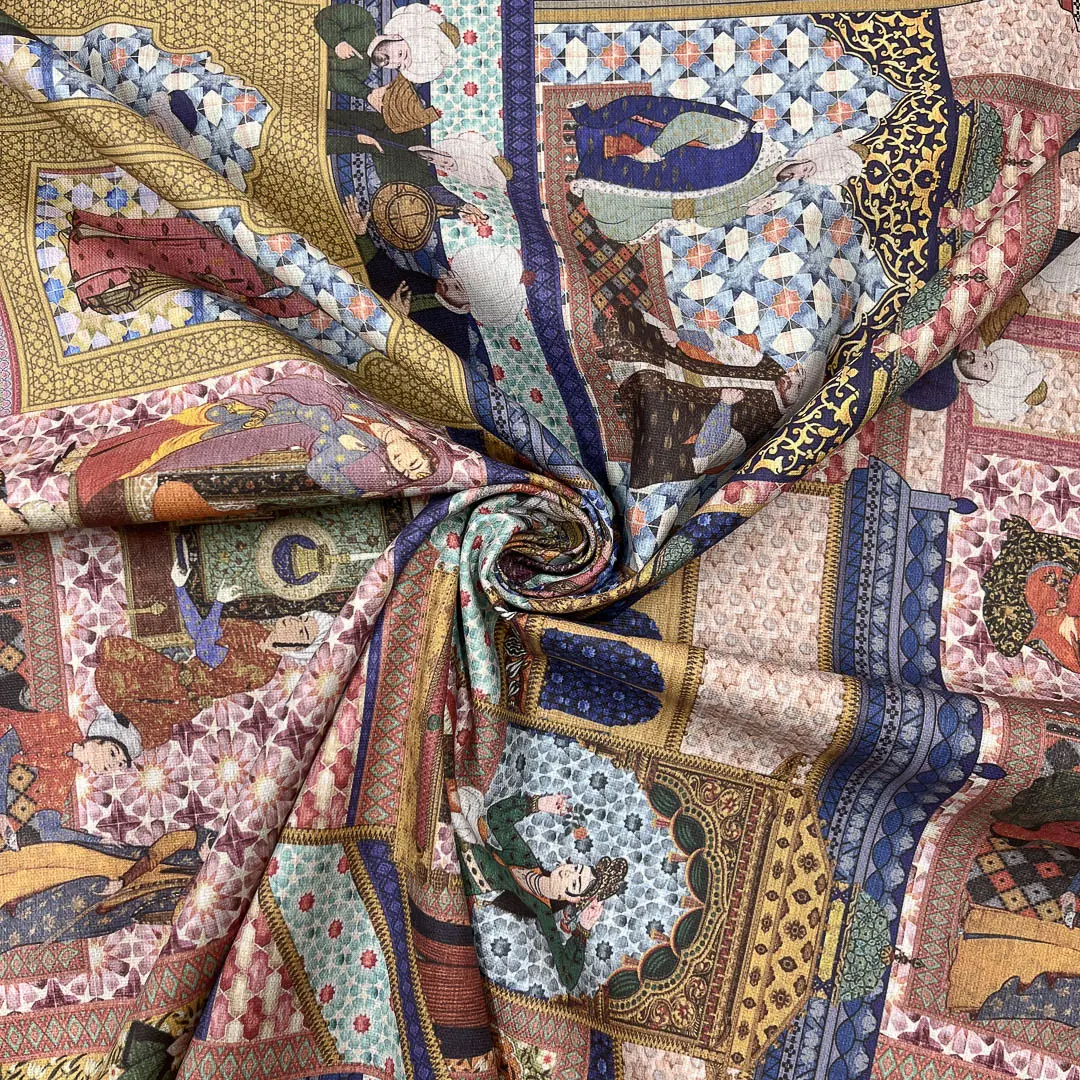 La fantasia si ispira all’arte islamica, caratterizzata da architetture con archi a ferro di cavallo e raffinati motivi geometrici. Il disegno è arricchito da figure umane in abiti tradizionali e copricapi, immerse in scene di vita quotidiana, come conversazioni, momenti di riposo e attività artigianali. I colori vivaci e i dettagli decorativi donano al tessuto un fascino unico, creando un’atmosfera ricca e suggestiva.