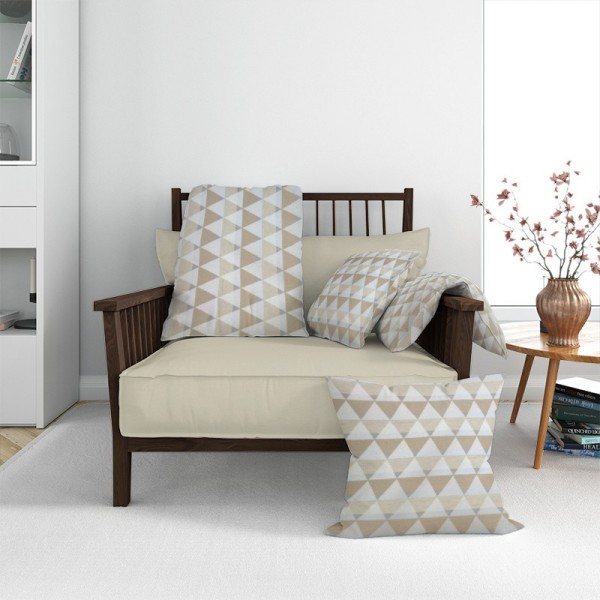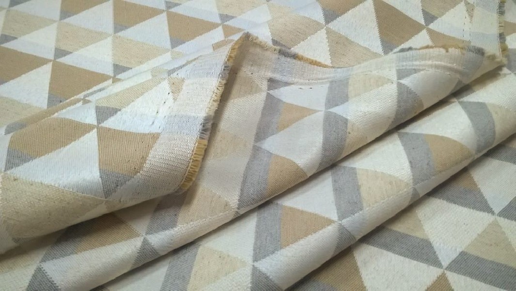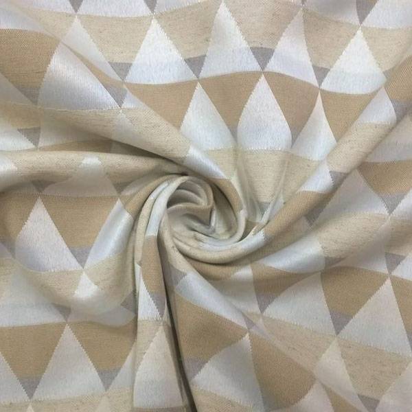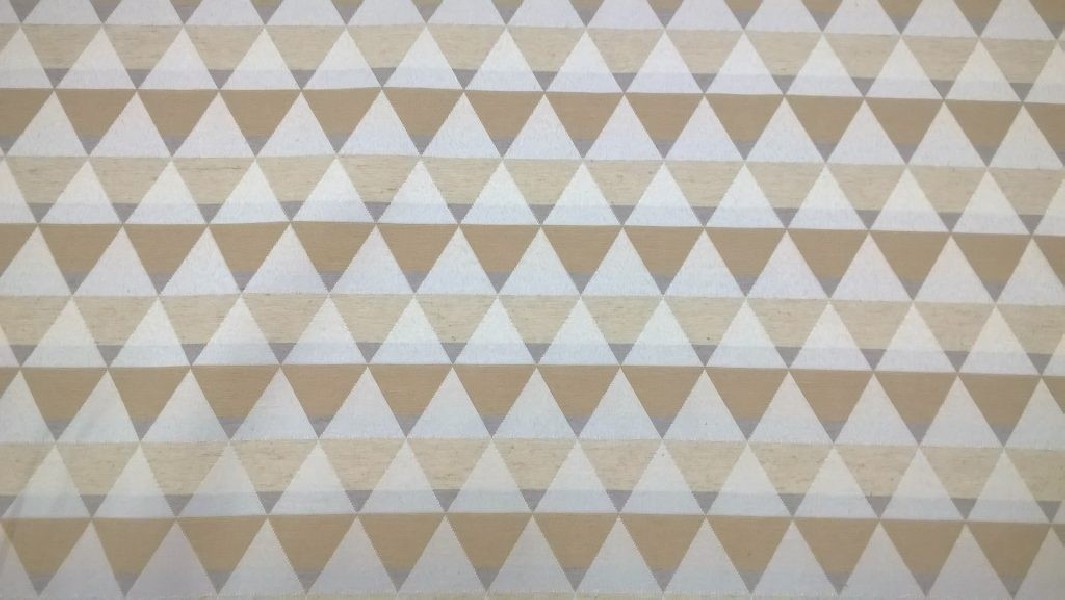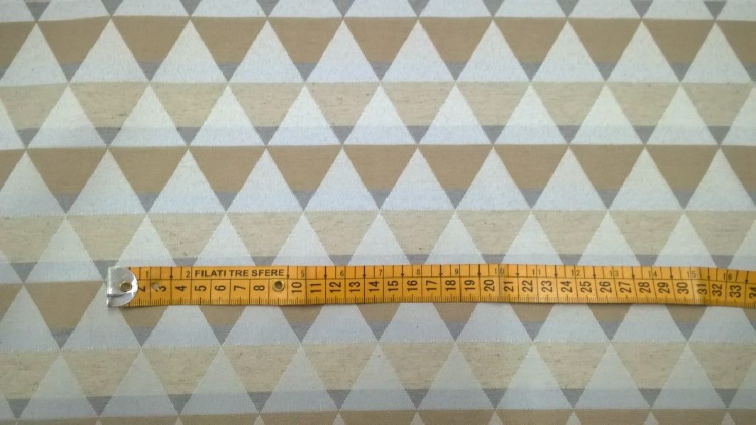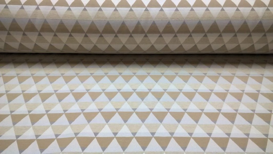 Tessuto in Misto Cotone a fantasia geometrica con triangoli in colori tortora, ecru e beige.