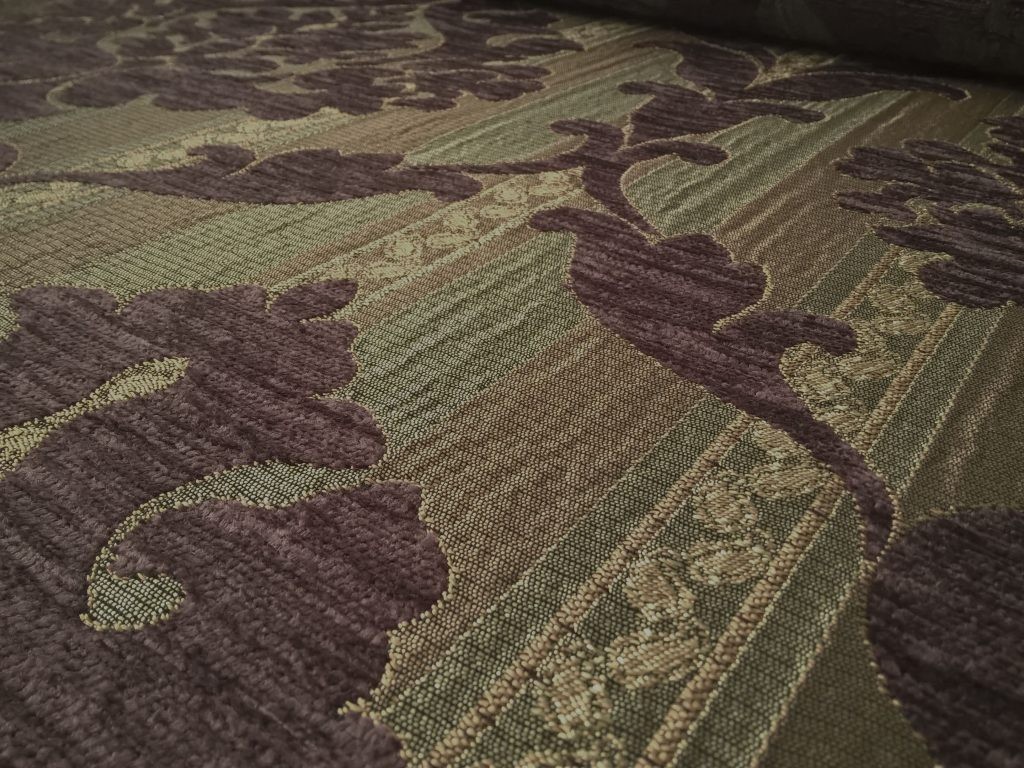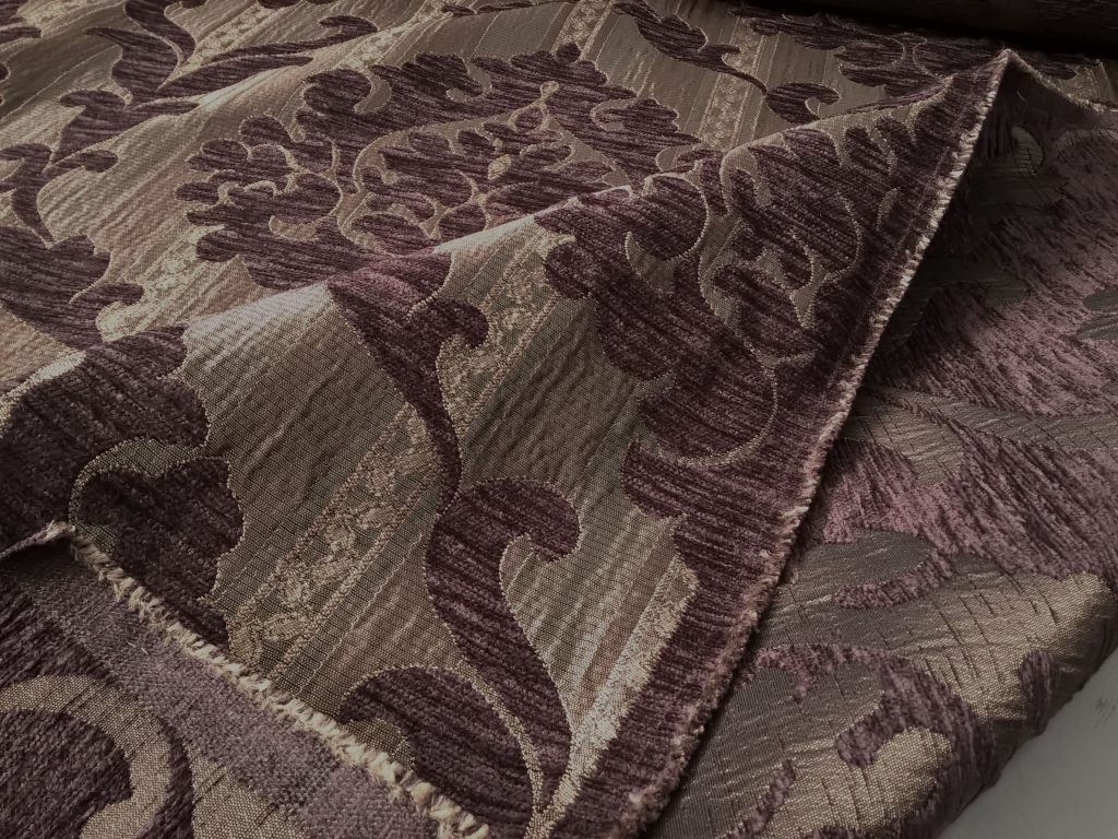 Tessuto per rivestimento motivo damascato – viola e bronzo