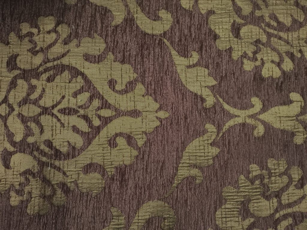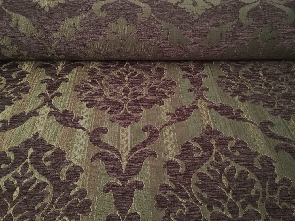 Tessuto in Misto Cotone con fantasia damascato nei colori viola prugna e bronzo. Effetto cinigliato.