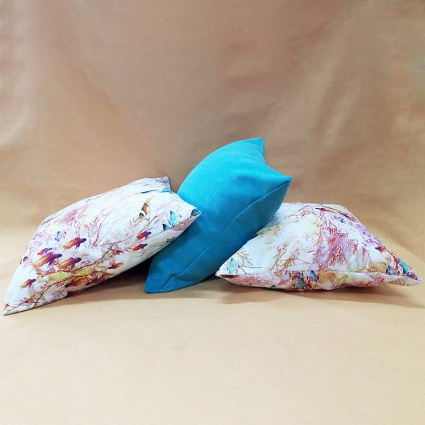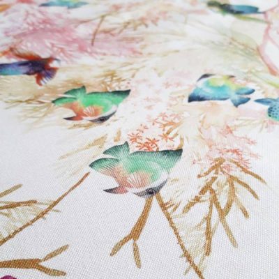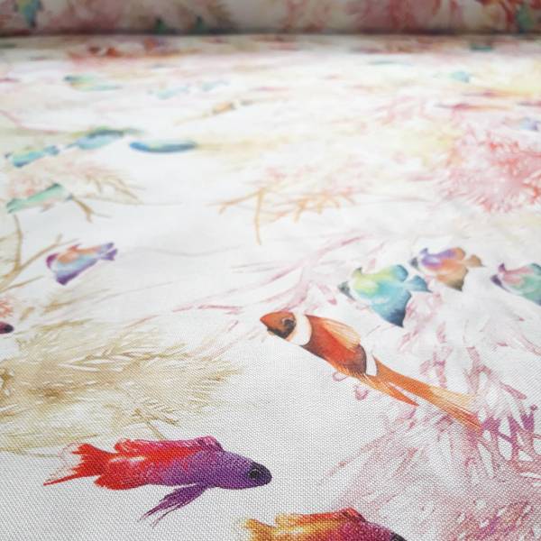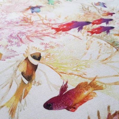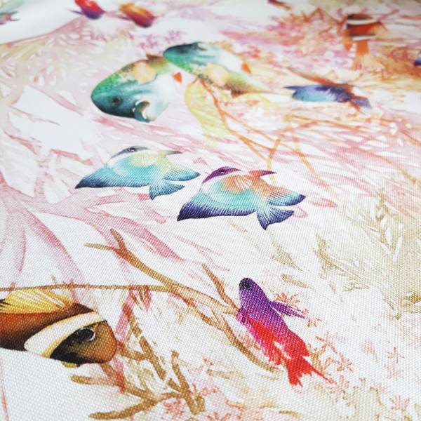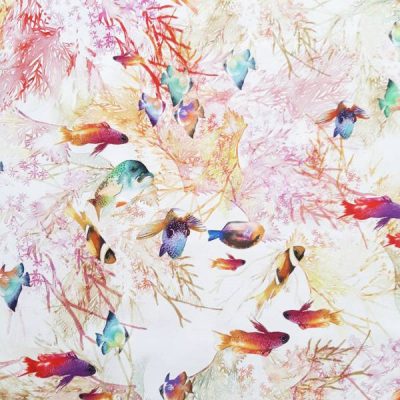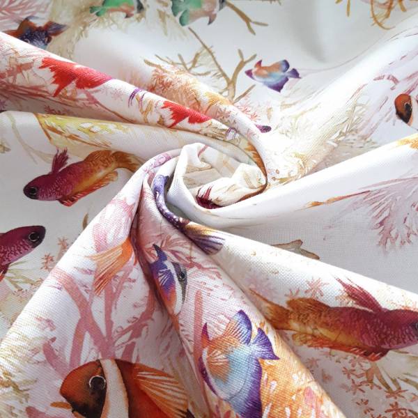 La stampa di questo tessuto Made in Italy è un affascinante mondo sottomarino con pesci multicolori e coralli che evocano la vita marina in tutta la sua magnificenza.