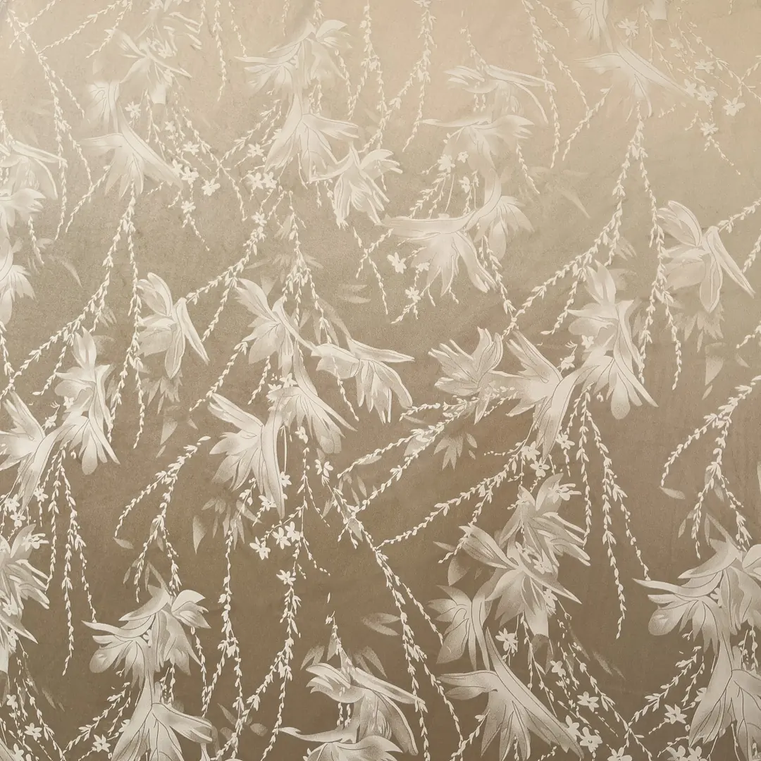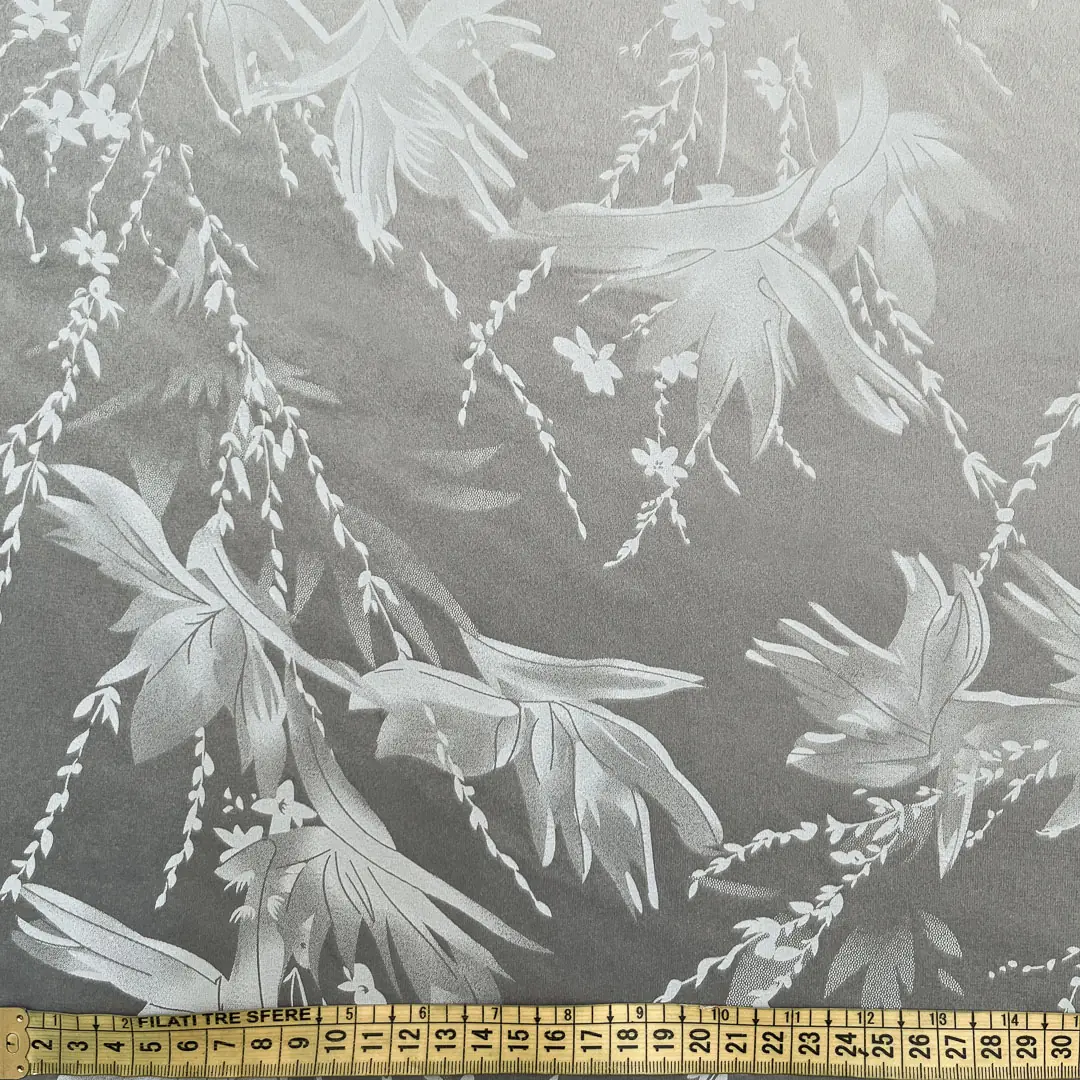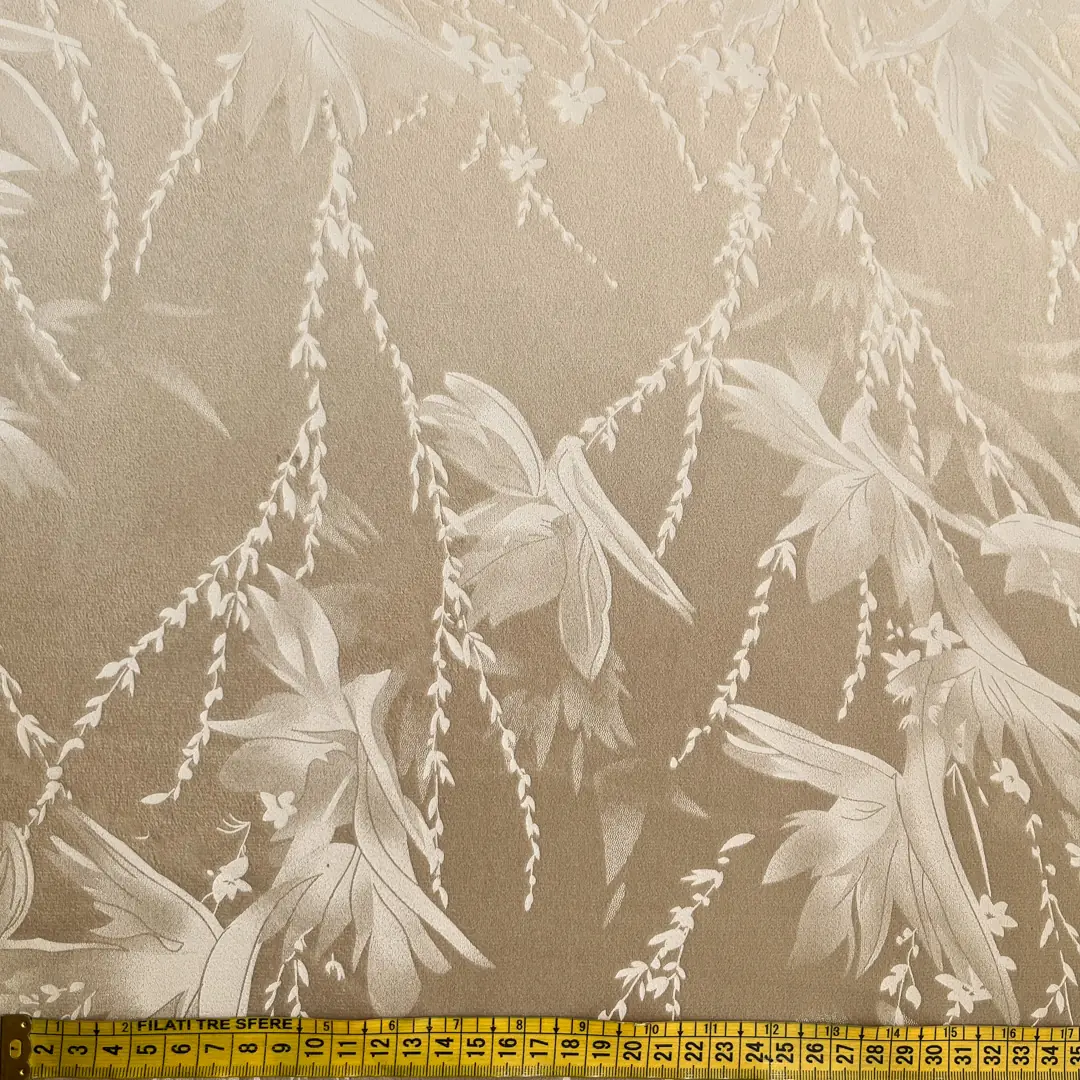 Il motivo, ispirato al damasco tradizionale con influenze barocche, si articola in un intreccio fluido di rami e fiori stilizzati, come delicati boccioli e foglie sinuose che si diramano in un pattern reversibile, con un rapporto di disegno di circa 60 cm che permette ripetizioni armoniose senza interruzioni visive.