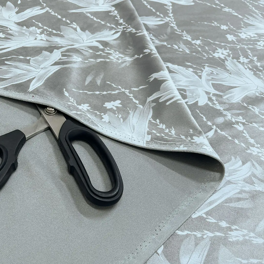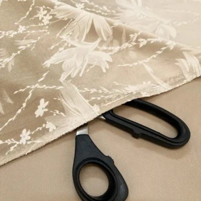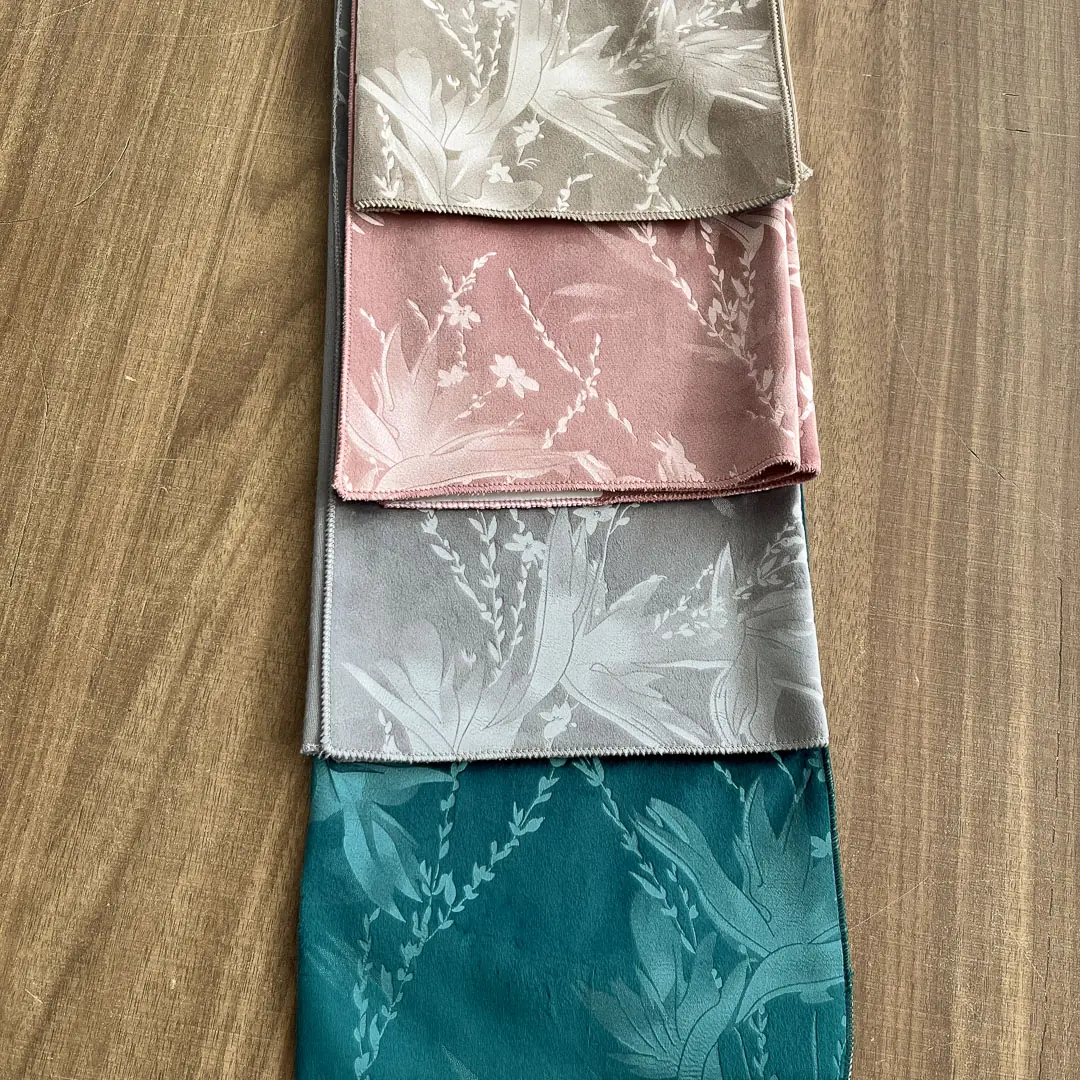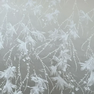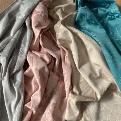 Il motivo, ispirato al damasco tradizionale con influenze barocche, si articola in un intreccio fluido di rami e fiori stilizzati, come delicati boccioli e foglie sinuose che si diramano in un pattern reversibile, con un rapporto di disegno di circa 60 cm che permette ripetizioni armoniose senza interruzioni visive.