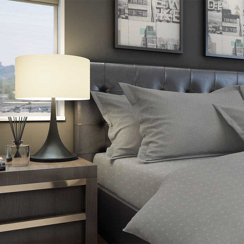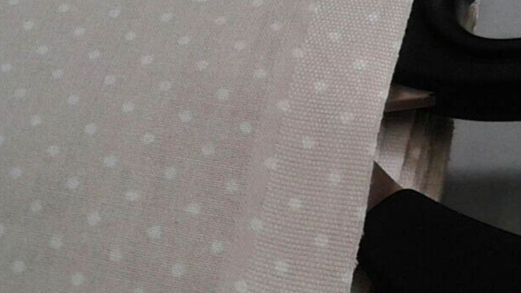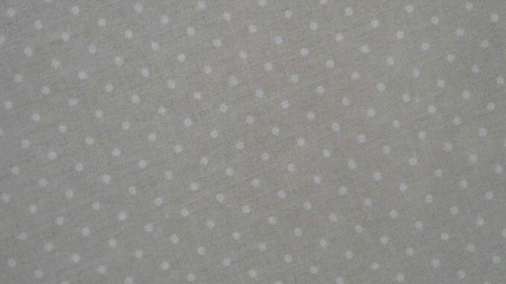 Tessuto in Rasatello di Cotone con fantasia a pois bianchi su sfondo tortora chiaro.
