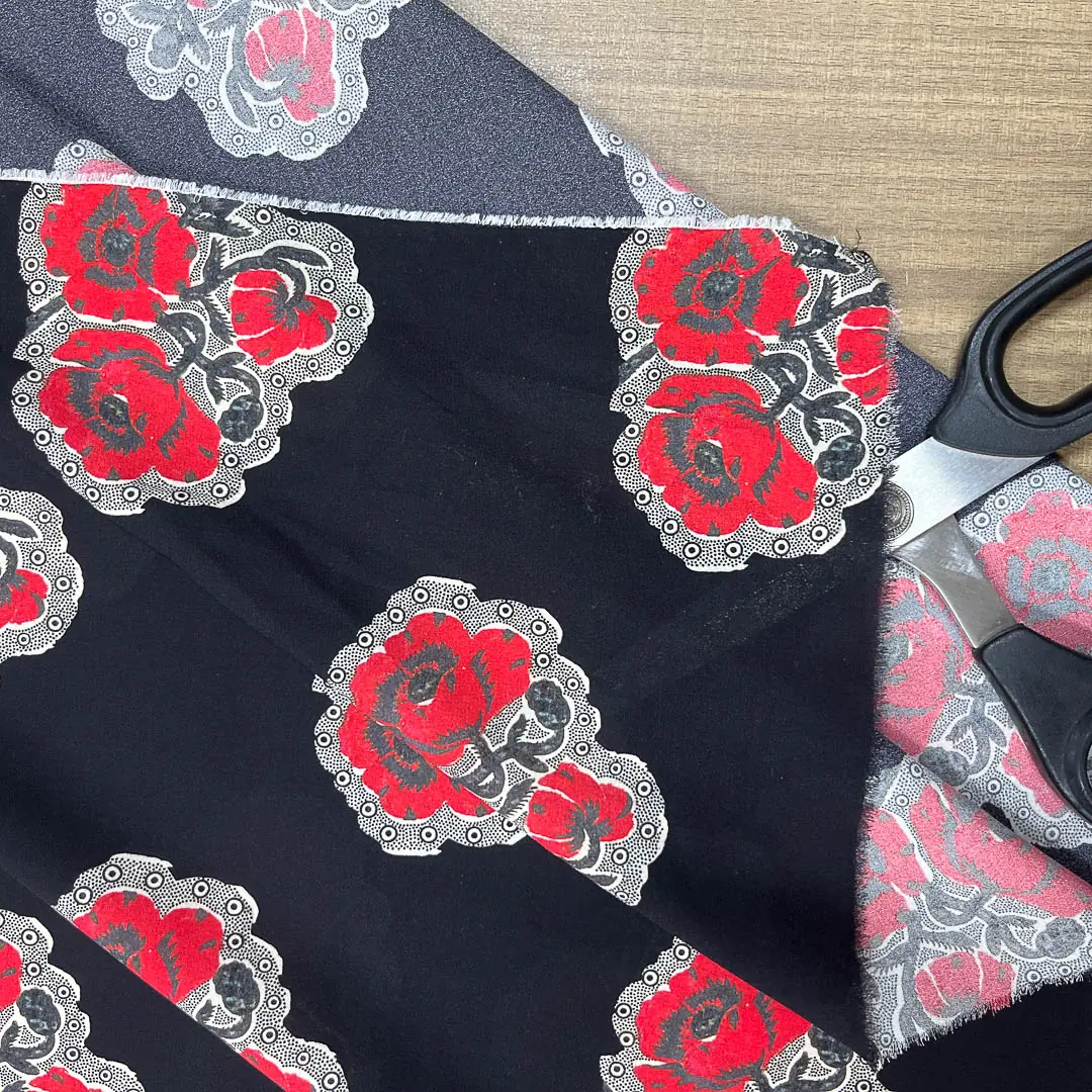 Questa stoffa presenta un fondo di colore nero su cui è stampato un motivo floreale. I fiori sono di colore rosso e bianco, con dettagli in grigio che ne sottolineano i contorni.