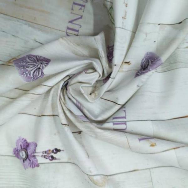 Tessuto in puro cotone con sfondo di colore bianco naturale con fantasia fiori di lavanda