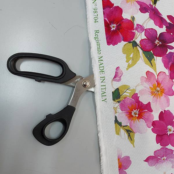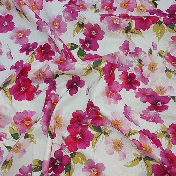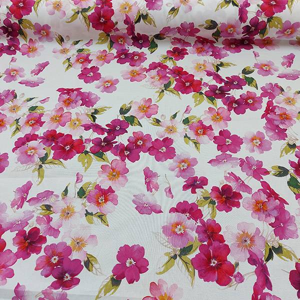 Tessuto per tovaglie del marchio Bottaro: sfondo bianco con fiori rosa e magenta
