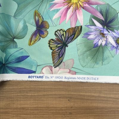 Tessuto per tovaglie del marchio Bottaro: stagno fiabesco con ninfeee e farfalle