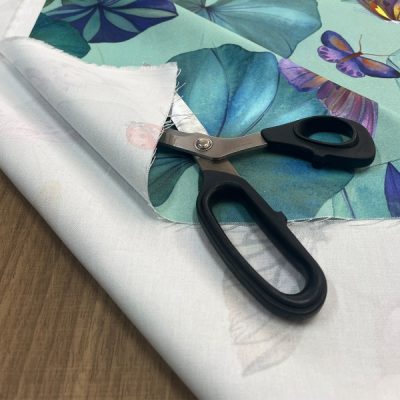 Le farfalle multicolori di questo tessuto sono disegnate con una tavolozza di colori vivaci, con tonalità di marrone, arancione, giallo, verde e giallo, che sembrano danzare sulla tovaglia. Ogni farfalla è un piccolo capolavoro di dettagli e colori sfumati. I fiori rosa, con i loro petali delicati e profumati, aggiungono un tocco di eleganza e femminilità, mentre le ninfee, con le loro foglie verdi e fiori in rosa, bianco e lilla conferiscono un tocco di grazia e serenità.