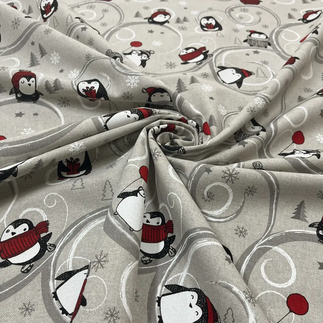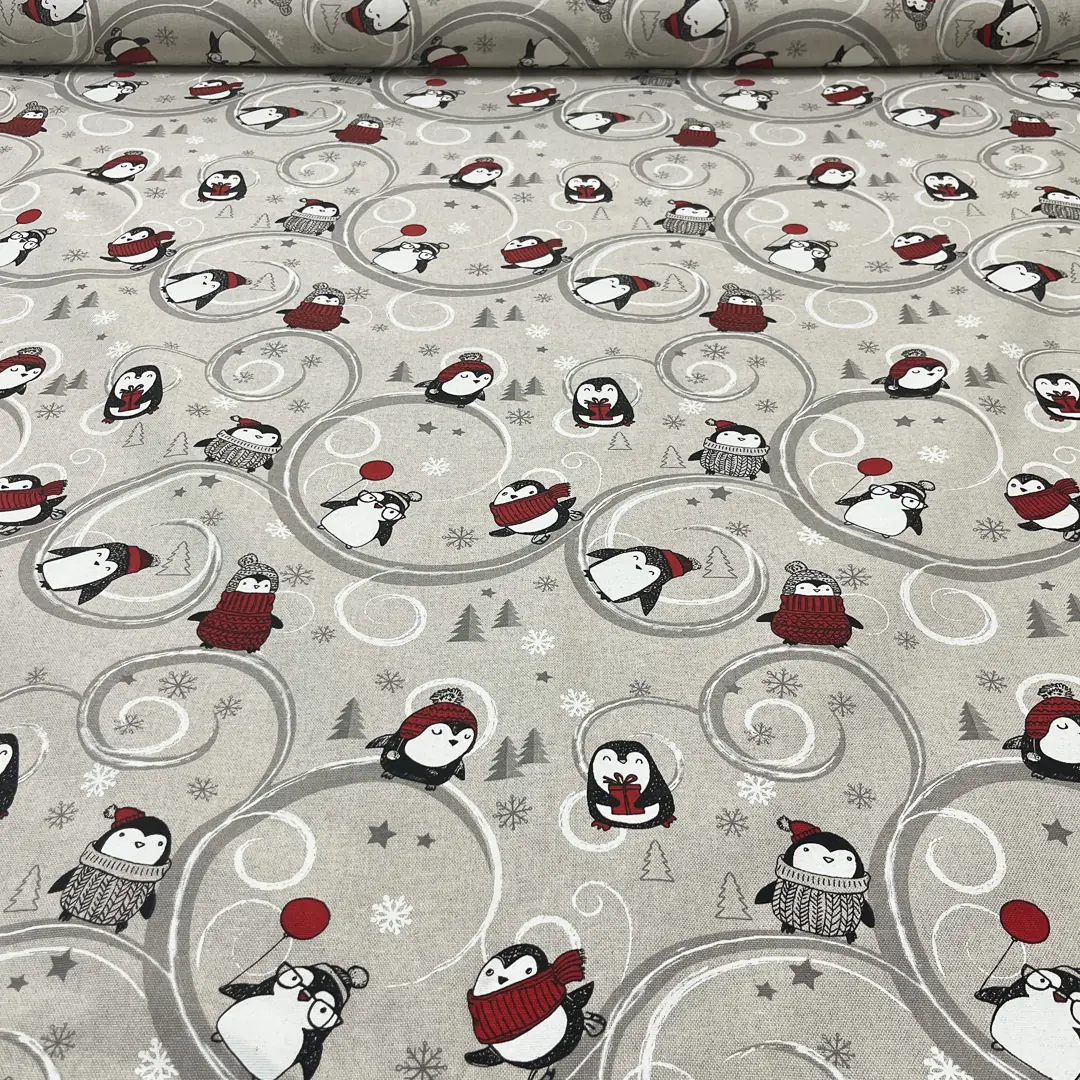Su uno sfondo grigio perla si sviluppa una divertentissima texture composta da pinguini e fiocchi di neve. Perfetto per tovagliati da sfoggiare nelle occasioni più importanti e attese. I più piccoli se ne innamoreranno di certo.. Versatile e multiuso è utilizzabile sia per tovagliato sia per calate e cuscini. La fantasia originale è ideale per rallegrare il vostro arredo grazie ai suoi colori vivaci. E’ un prodotto molto resistente grazie alla tramatura fitta e compatta. E’ morbido al tatto e di facile lavorazione quindi questo tessuto è adatto per confezionare tovaglie e runner, copripiumini e cuscini. Ideale per donare un tocco allegro alla tua casa.