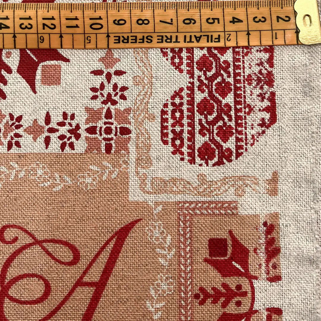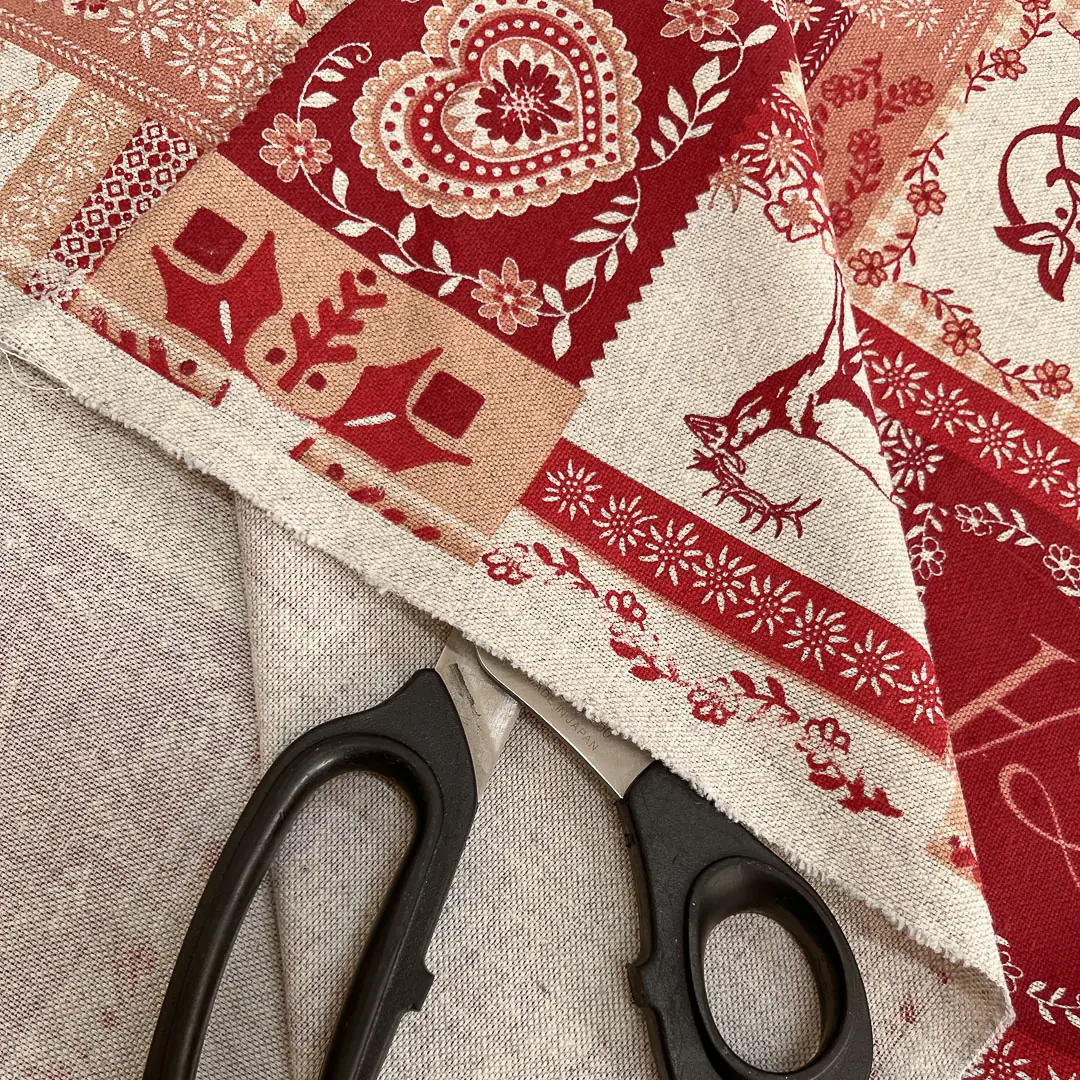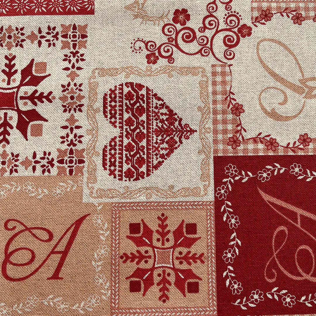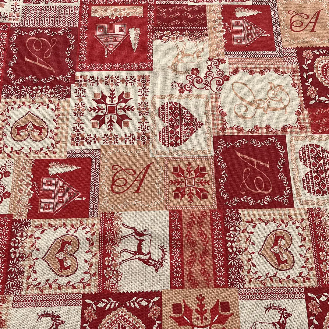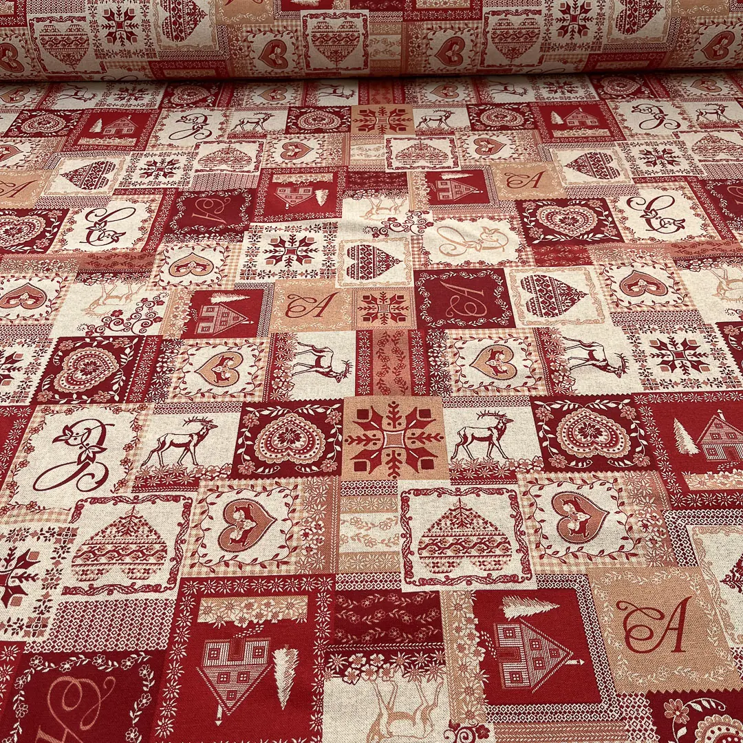 Questo tessuto tirolese natalizio, realizzato in un delicato mix di 80% cotone e 20% poliestere, presenta una splendida fantasia stile collage che richiama l’atmosfera calda e accogliente delle festività. Il tessuto è decorato con una varietà di dettagli che includono scritte festose, fiocchi di neve, fiori e cuori, tutti impreziositi da tonalità ricche di rosso, terracotta e tortora chiaro. Ogni elemento si intreccia in un disegno armonioso, perfetto per portare un tocco di tradizione e di calore natalizio in ogni ambiente, ideale per realizzare tende, copridivani, tovaglie e altri accessori natalizi. La combinazione dei colori caldi e dei motivi tipici del Tirolo dona al tessuto un carattere rustico e sofisticato, perfetto per chi cerca un’atmosfera festiva e accogliente.