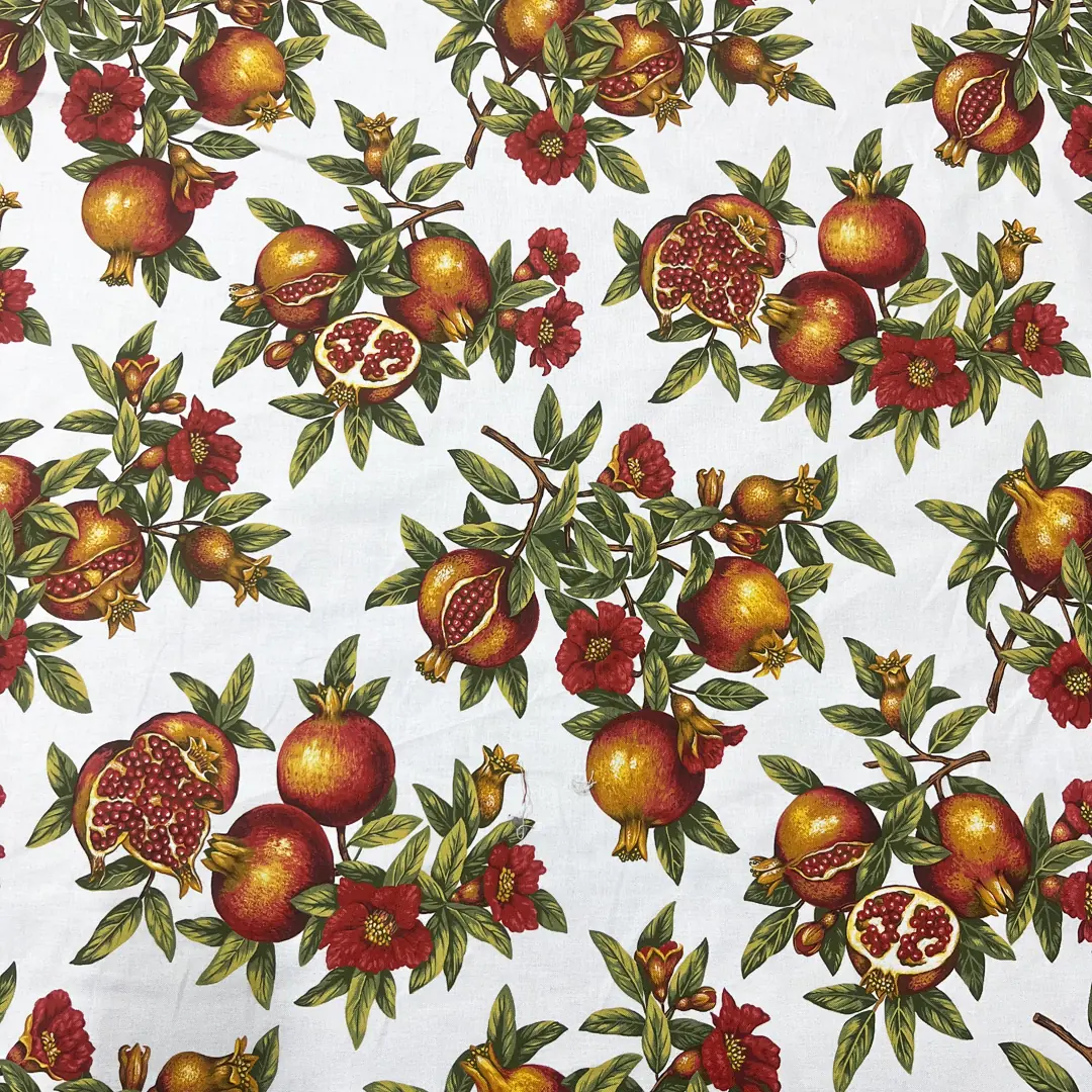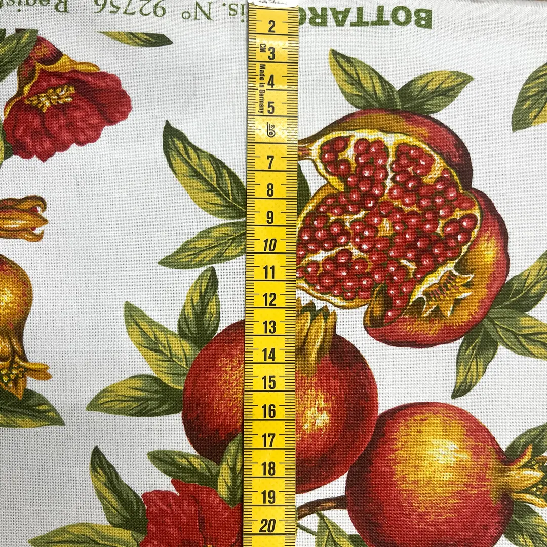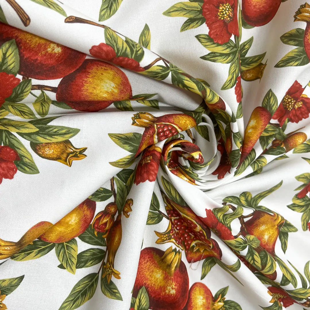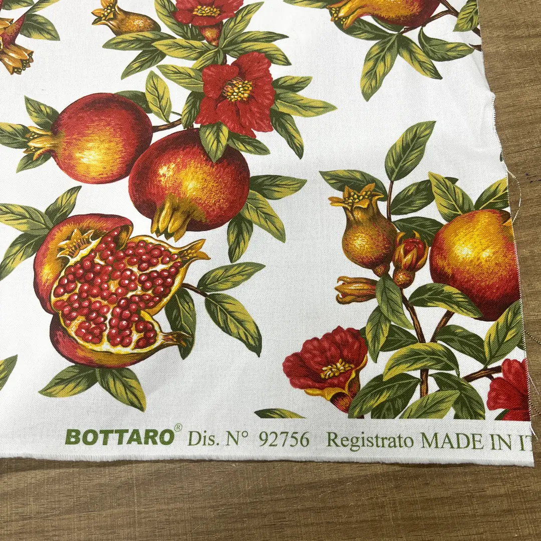 La tessitura uniforme valorizza la stampa a melograni ad alta definizione, con contorni nitidi e un’ottima resa dei dettagli, segno di coloranti solidi e finissaggio di livello, caratteristici della produzione Bottaro interamente Made in Italy.