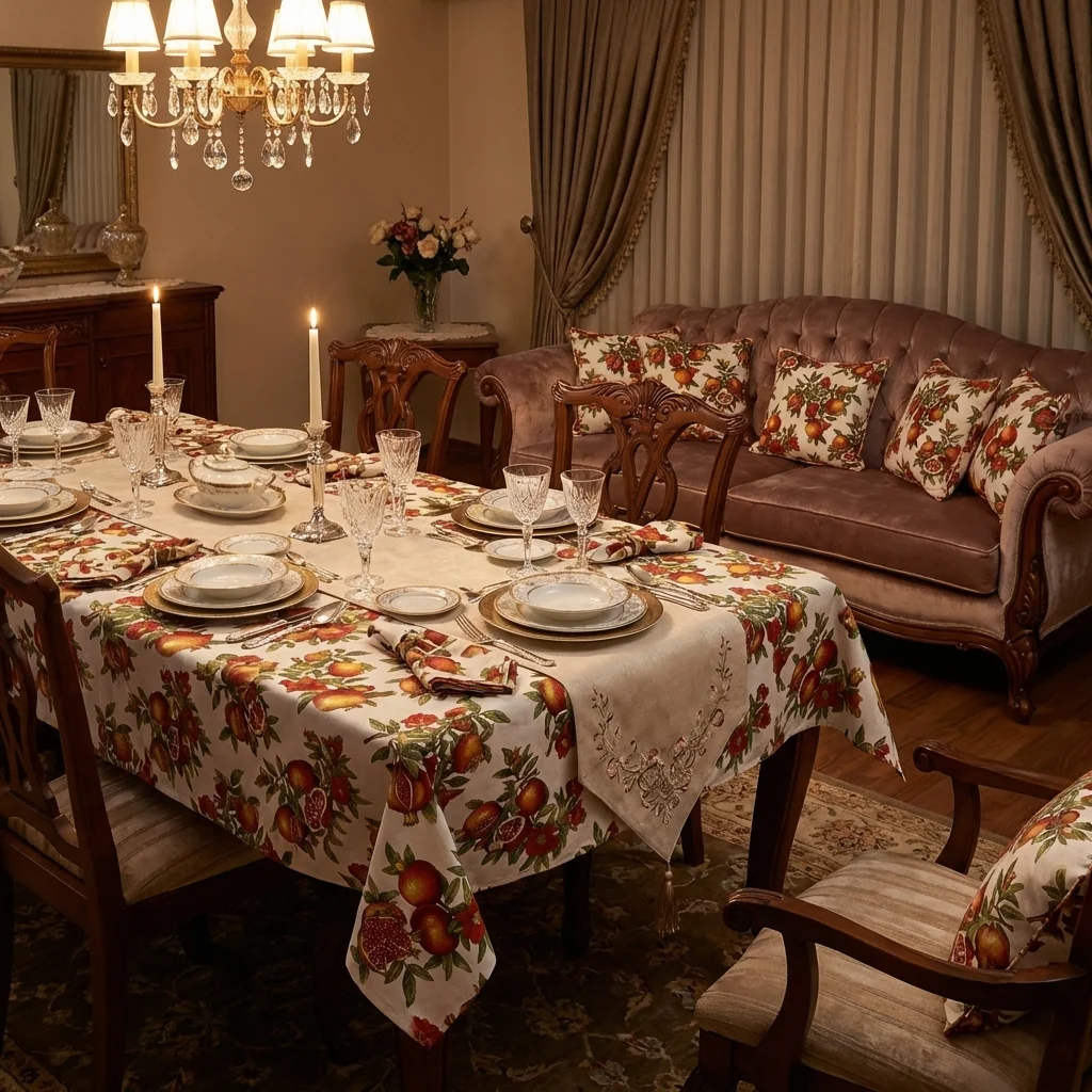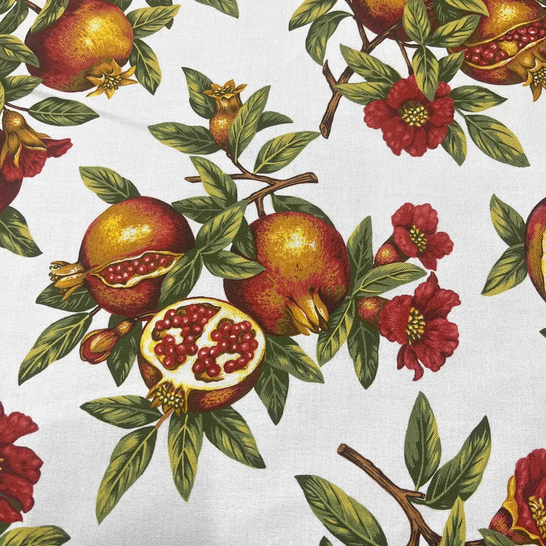 Il tema del melograno, simbolo di abbondanza e convivialità nella tradizione mediterranea, rende questo tovagliato particolarmente adatto alla tavola delle feste, alle cene importanti e agli ambienti country-chic o rustici eleganti.