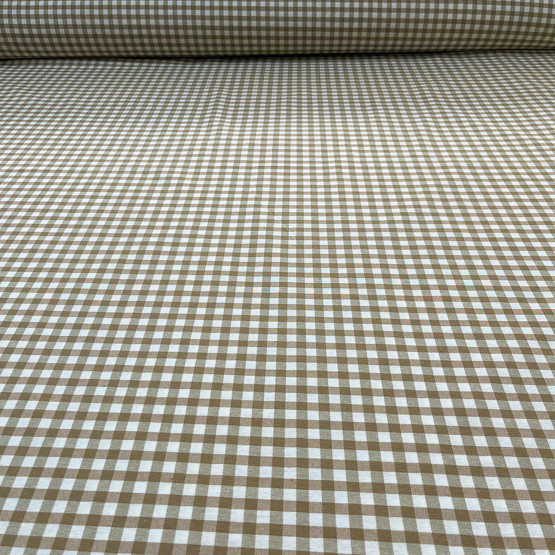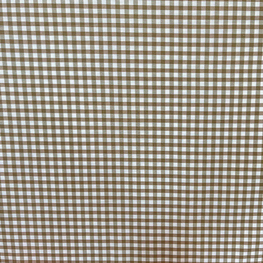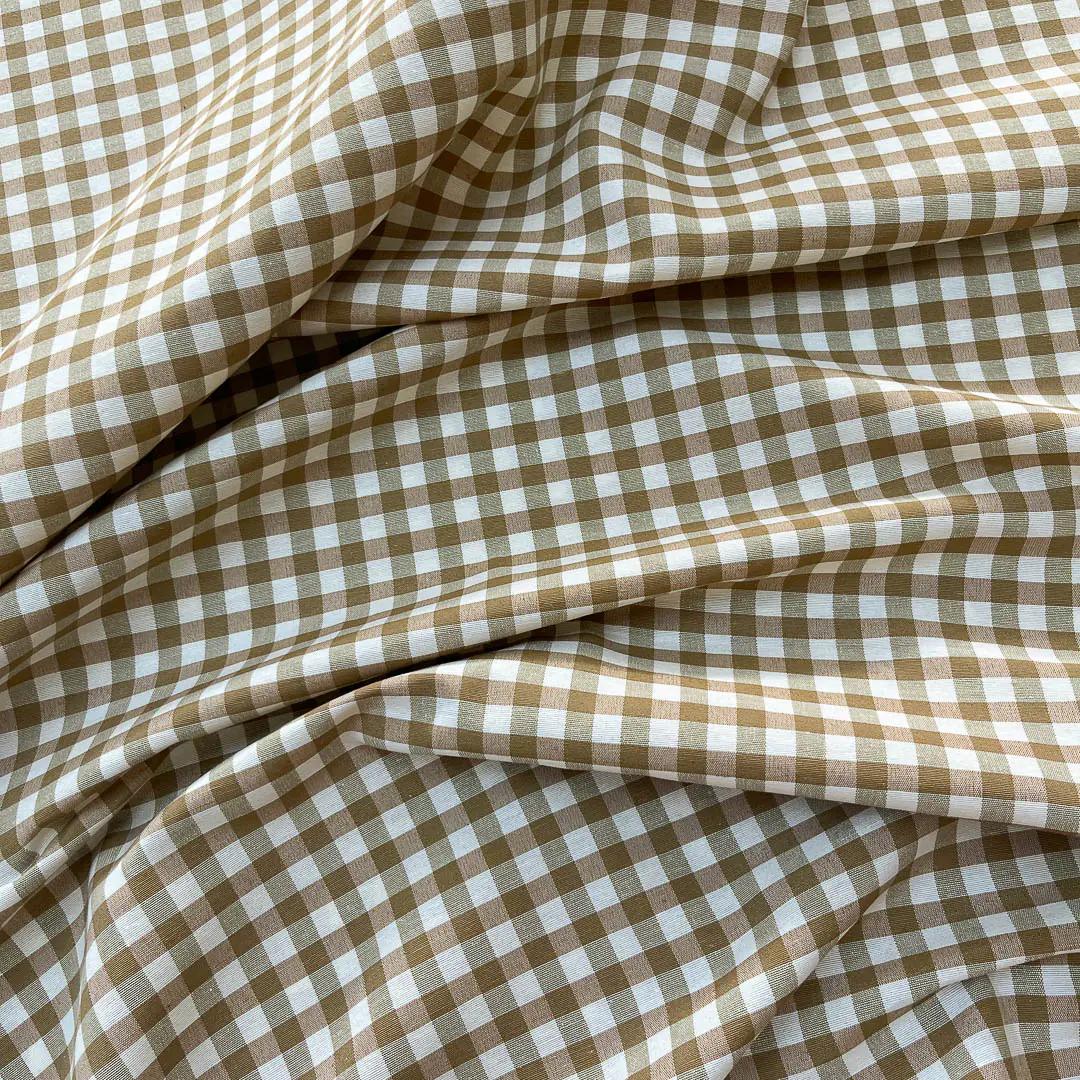 Il tessuto gingham è noto per il suo design a quadretti regolari, tipicamente creato con filati colorati disposti in un pattern intrecciato. In questo caso, i quadretti sono bianco e marrone chiaro, dando un aspetto semplice e pulito.