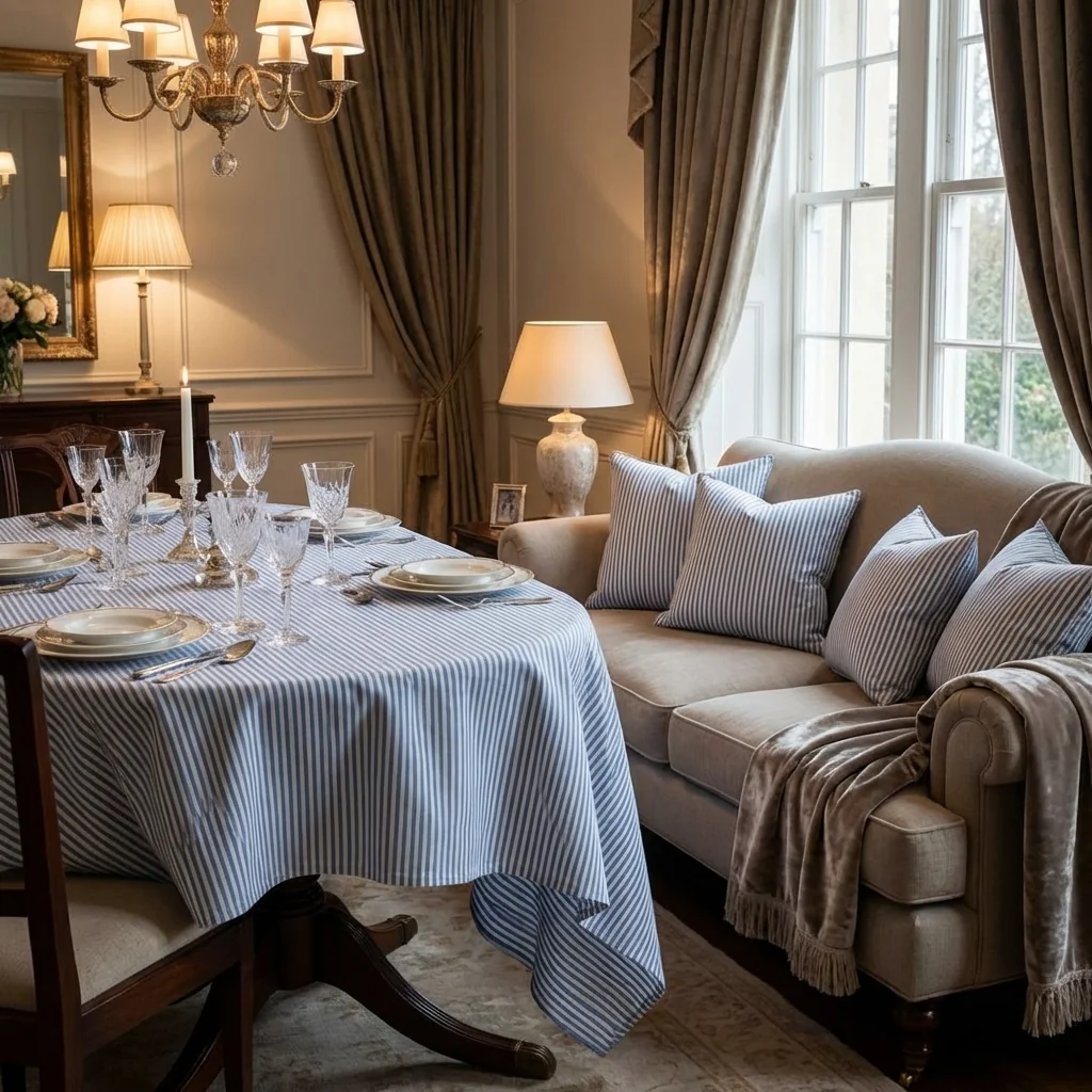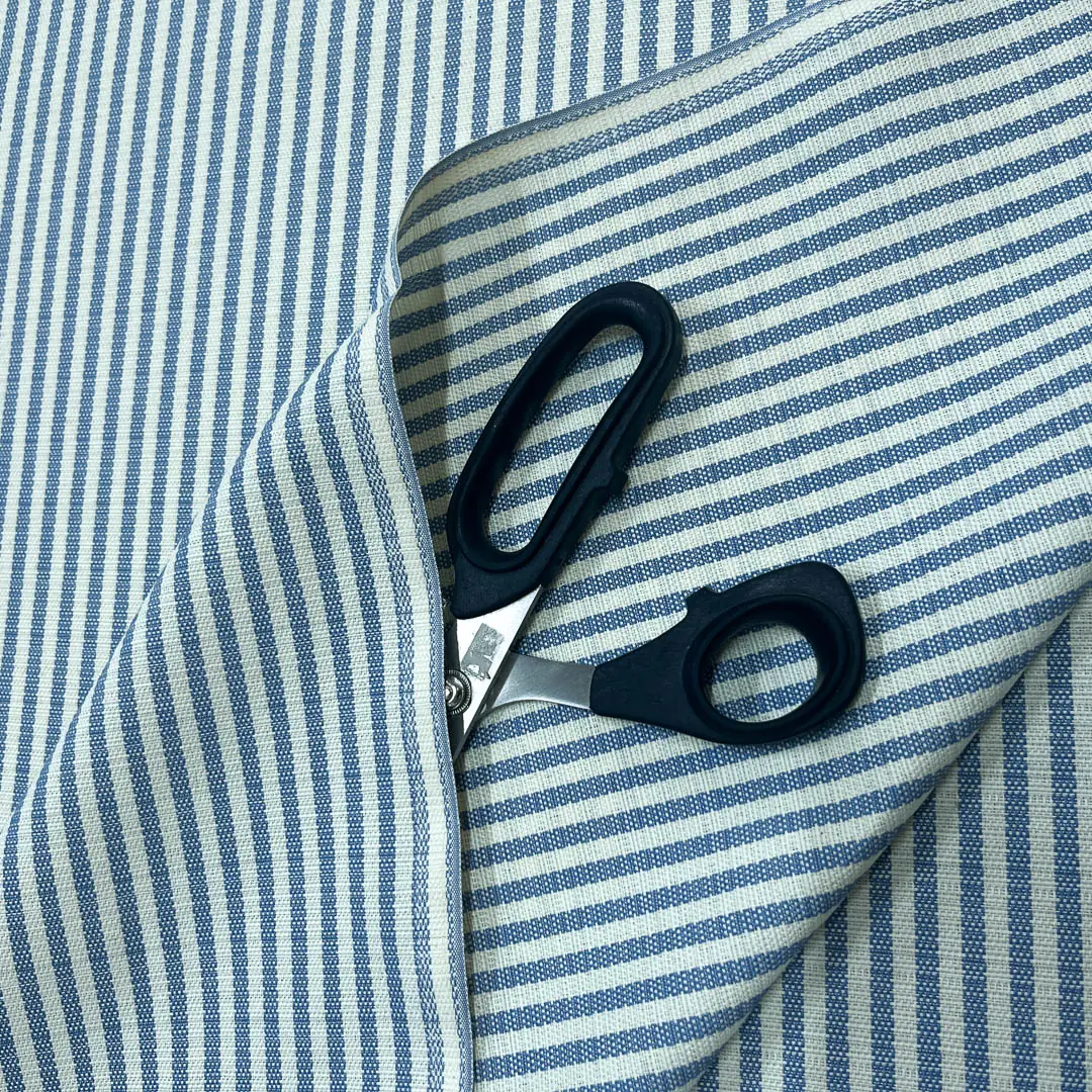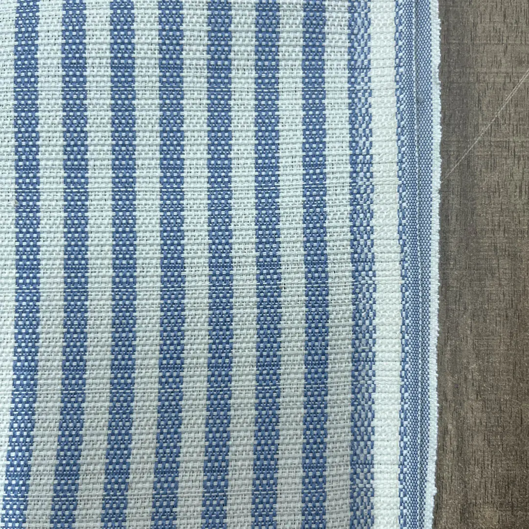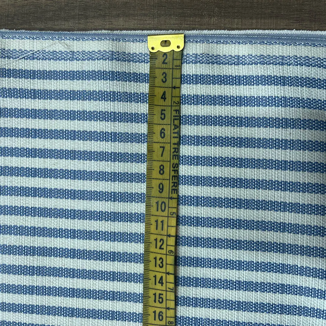 Il contrasto delicato tra le strisce blu chiaro – fresche e sobrie – e la base bianco naturale dona al tessuto eleganza e luminosità, rendendolo perfetto sia per ambienti classici che contemporanei, adattandosi con facilità a diversi stili di arredamento.