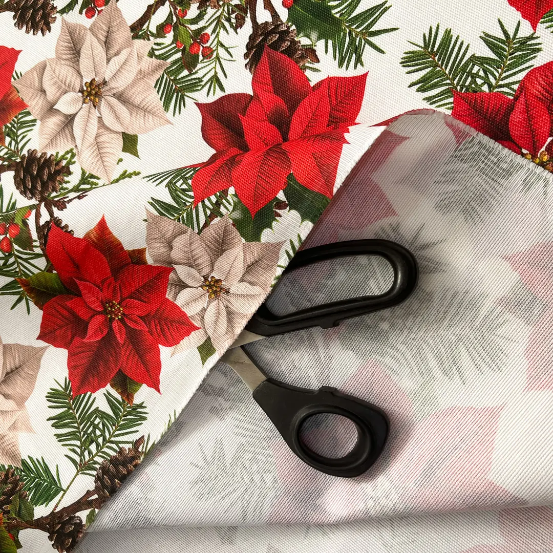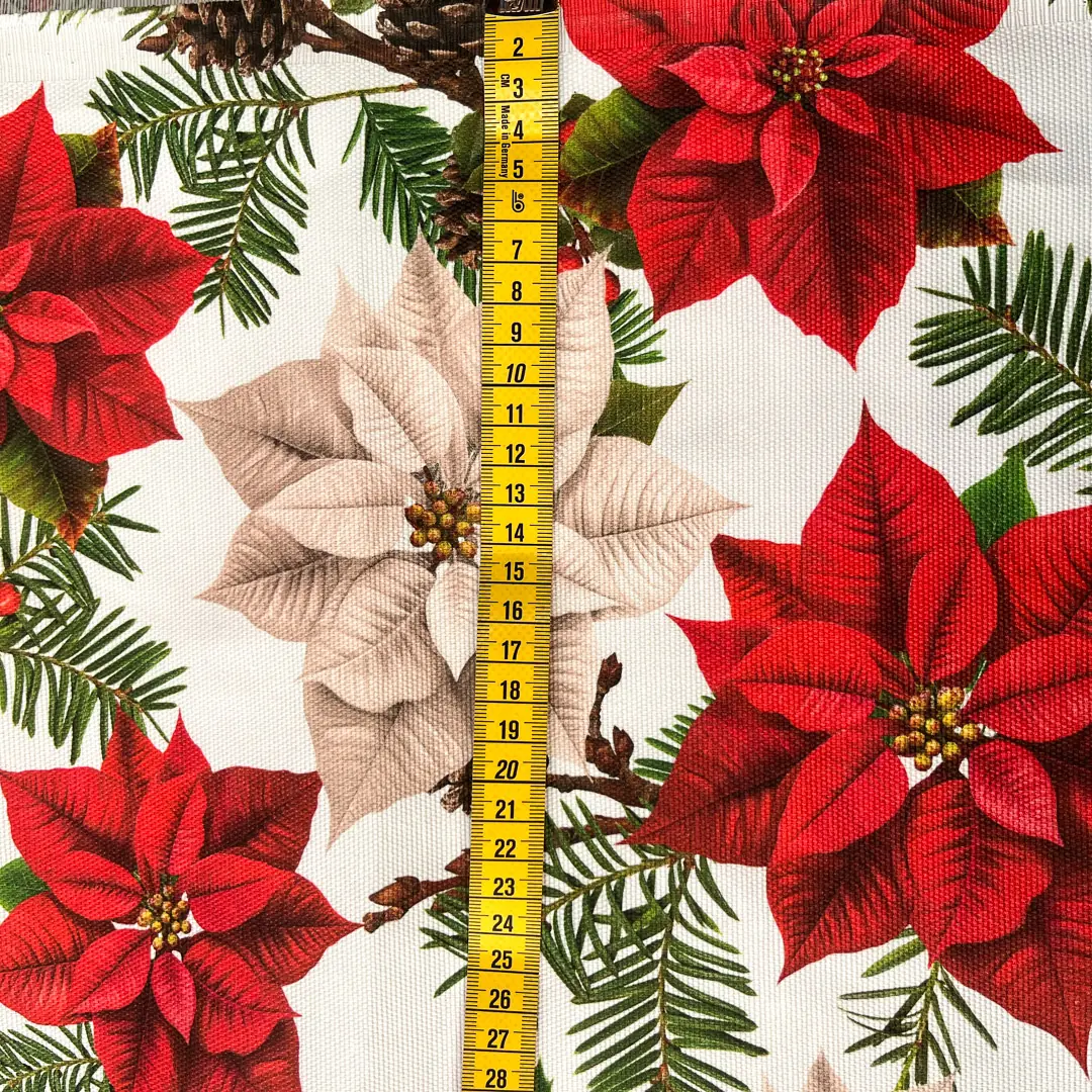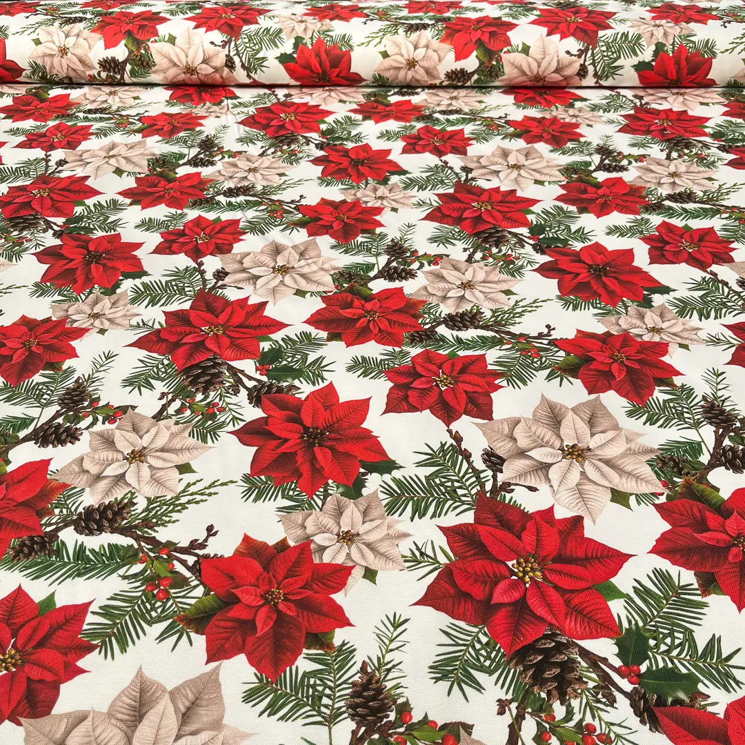 Stoffa natalizia per tovaglie con stelle di Natale, pigne e bacche rosse – semi idrorepellente