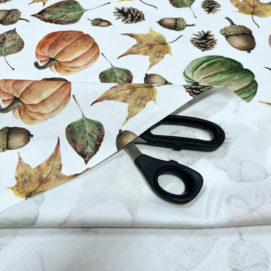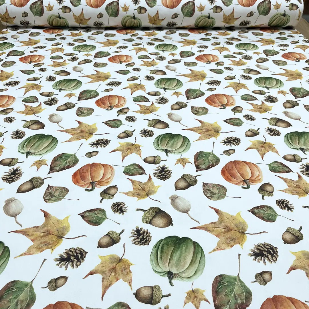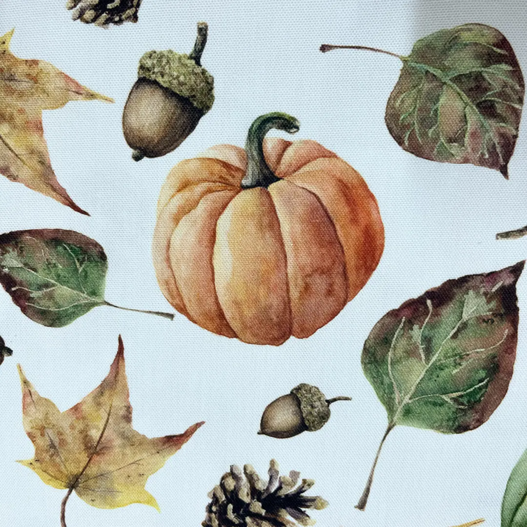 Il disegno riproduce, con effetto acquerello, una composizione di zucche ornamentali, foglie secche, pigne e ghiande distribuite in maniera regolare su tutta la larghezza del tessuto, creando un pattern all over equilibrato e senza direzionalità marcata, facile da centrare nei tagli e perfetto anche per tovaglioli, copritavolo, cuscini e accessori coordinati.