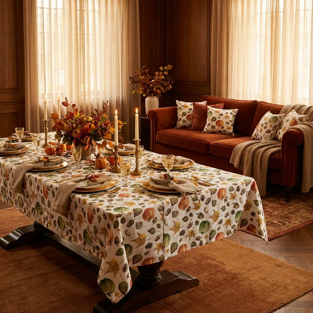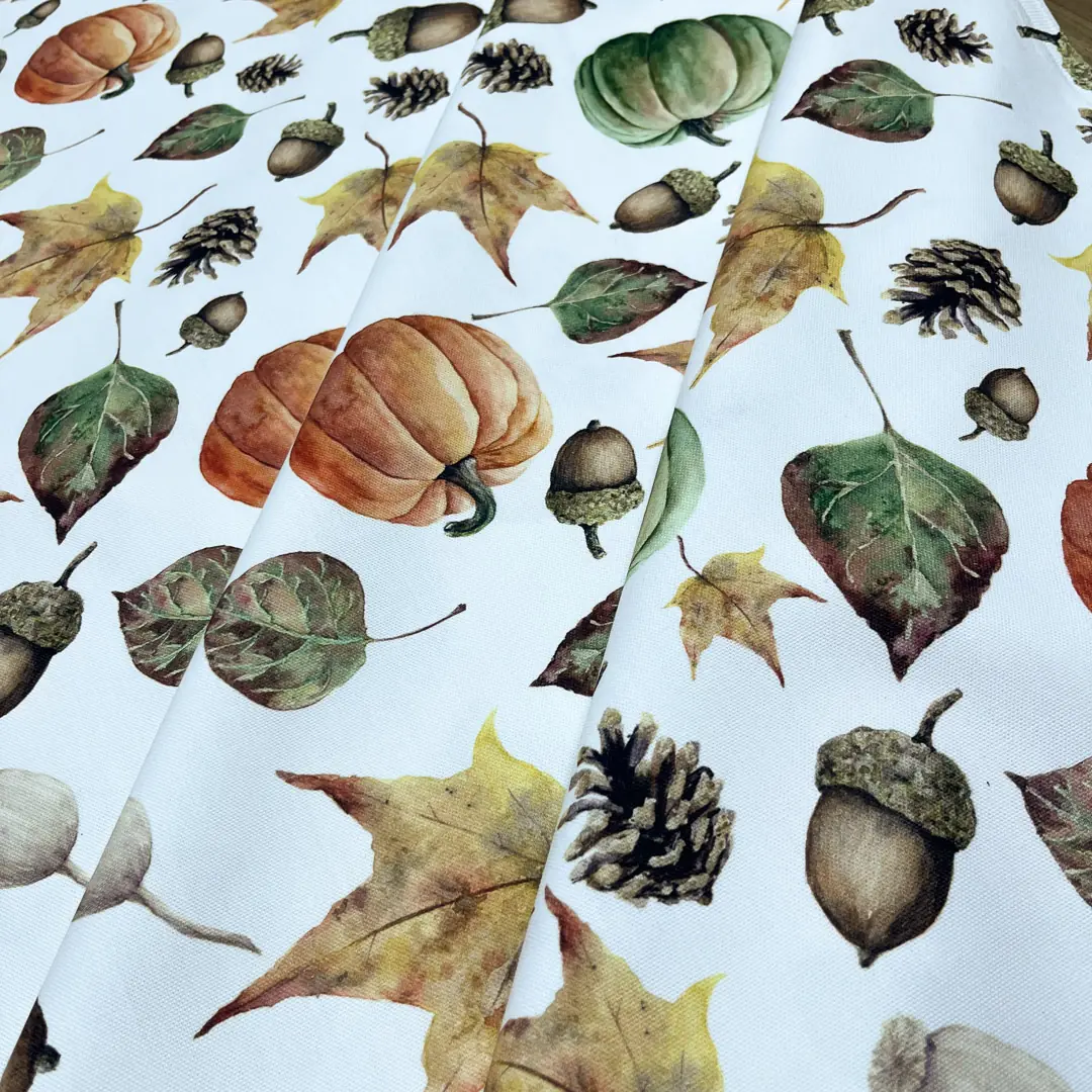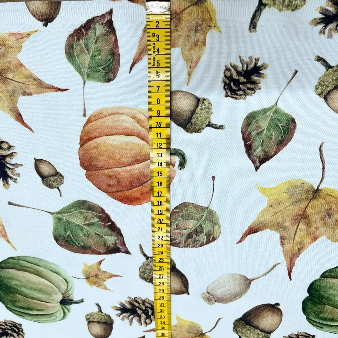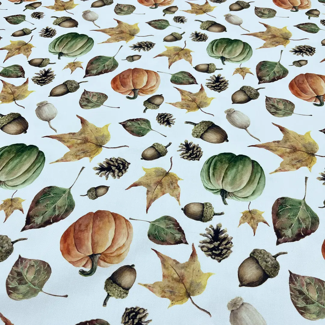 Il disegno riproduce, con effetto acquerello, una composizione di zucche ornamentali, foglie secche, pigne e ghiande distribuite in maniera regolare su tutta la larghezza del tessuto, creando un pattern all over equilibrato e senza direzionalità marcata, facile da centrare nei tagli e perfetto anche per tovaglioli, copritavolo, cuscini e accessori coordinati.