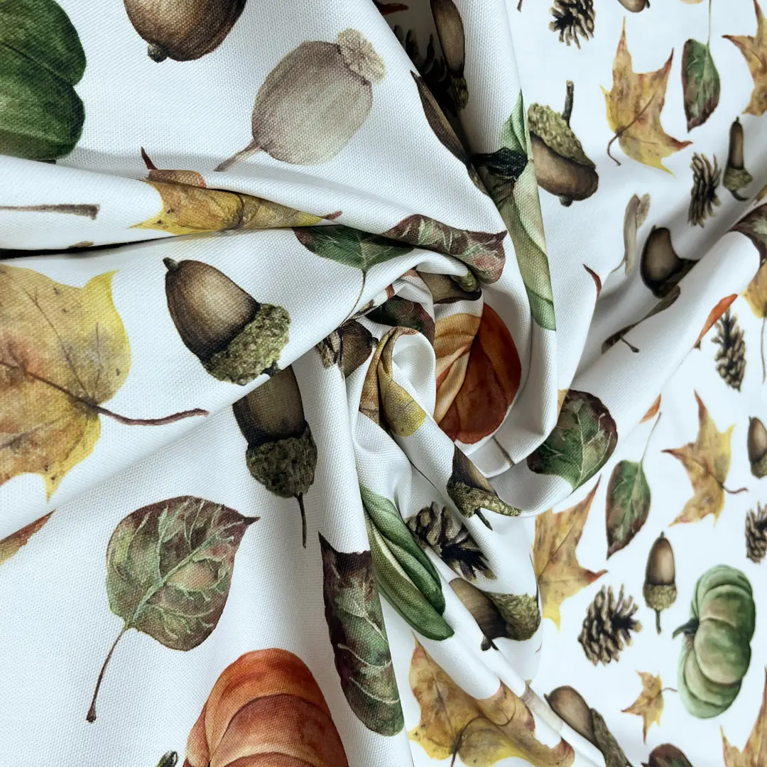 Tessuto per tovaglie natalizie misto cotone poliestere con stampa digitale ad alta definizione, caratterizzato da un fondo bianco pulito che esalta un motivo autunnale-boschivo dal gusto caldo e naturale.