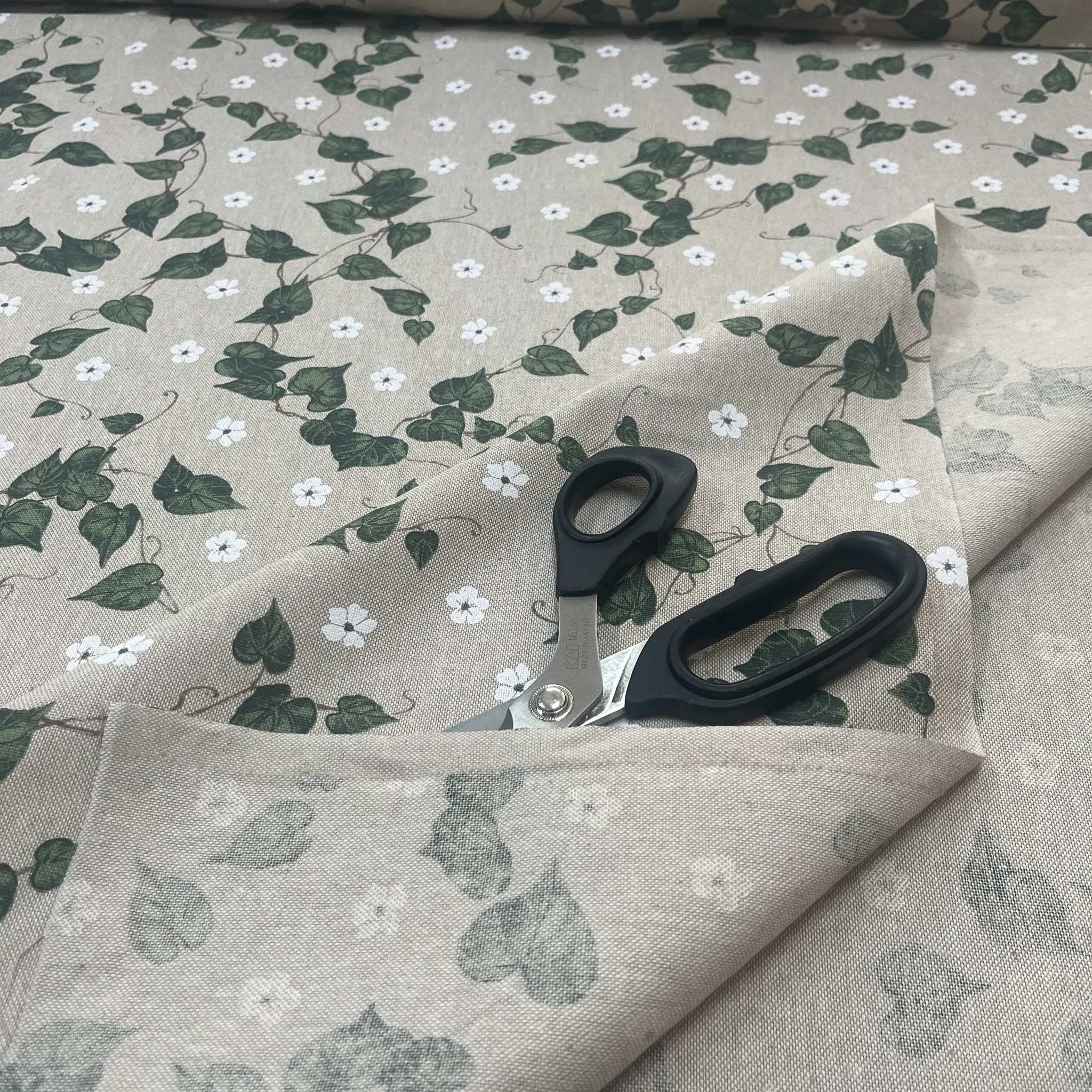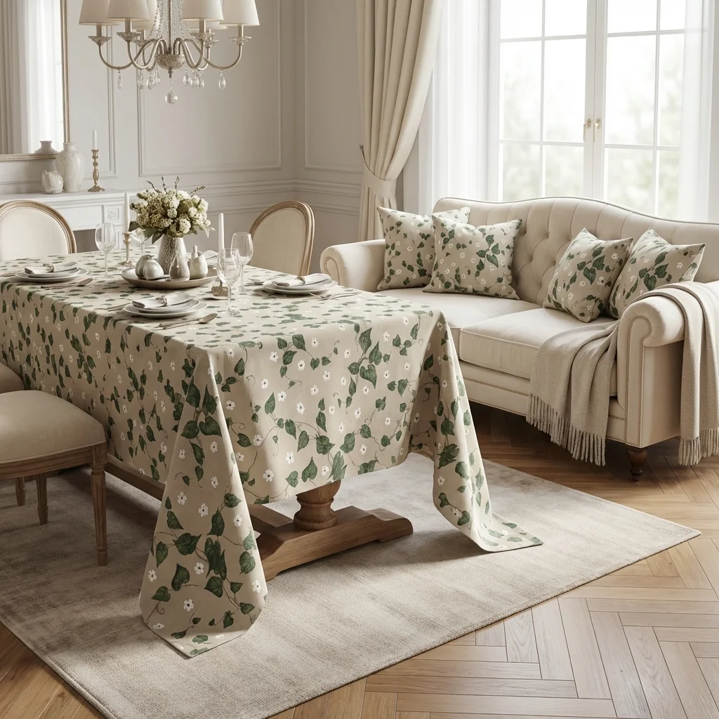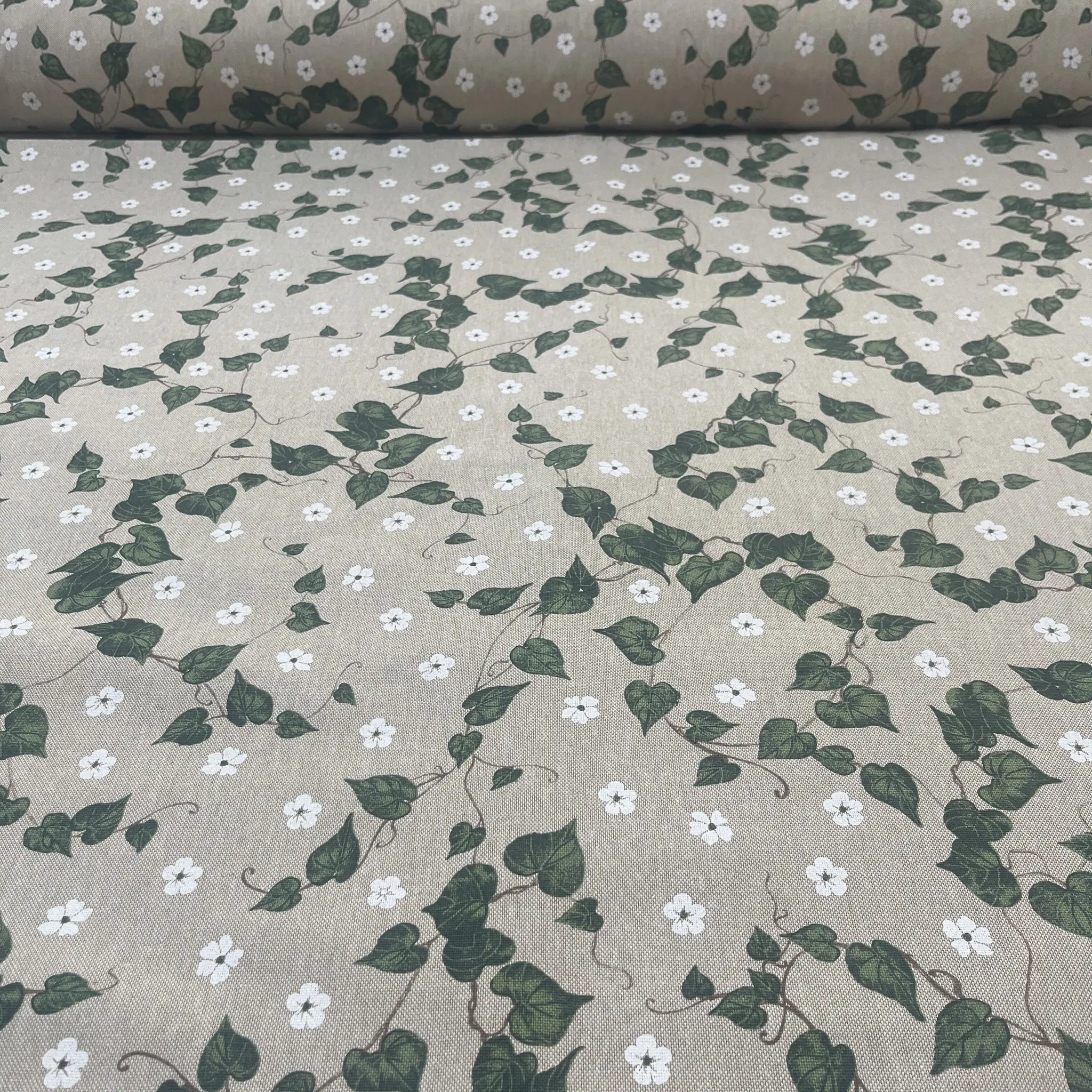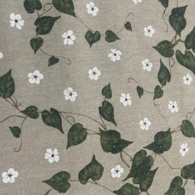 Su questa base neutra corre un motivo fitto e leggero di tralci rampicanti, con foglie verde scuro e verde medio dal disegno ben definito, che creano un piacevole movimento diagonale sulla superficie.