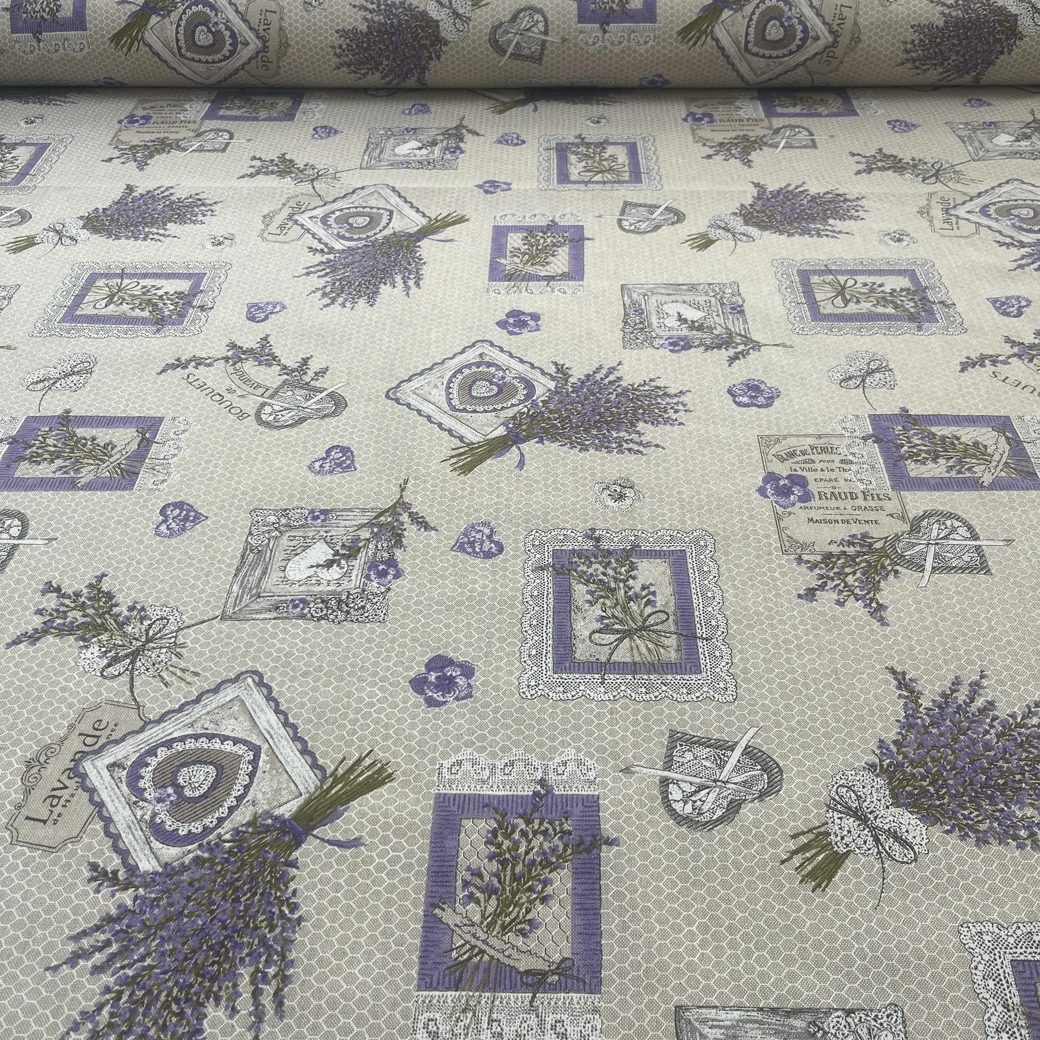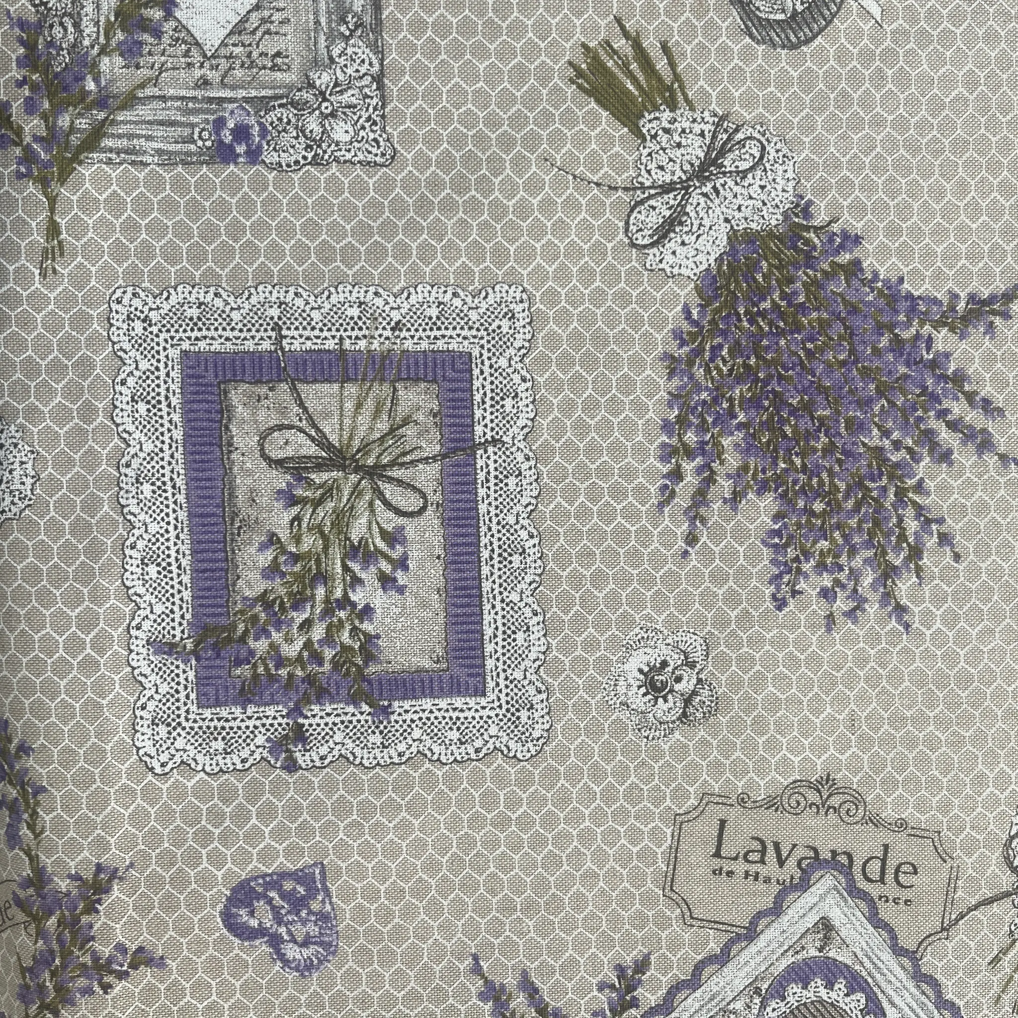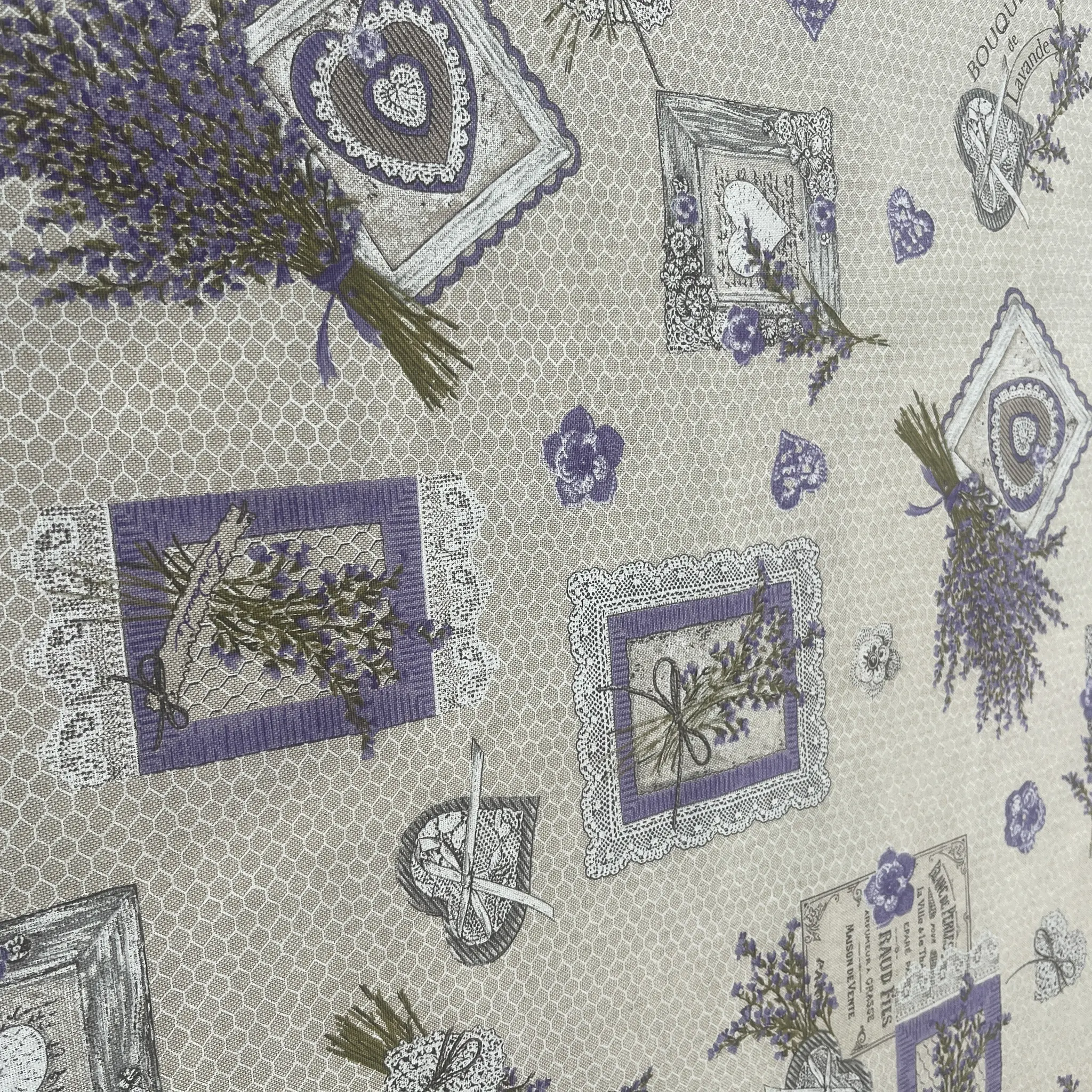 Il motivo è un all‑over in stile provenzale: mazzi di lavanda nei toni del lilla e del viola medio, con tocchi di verde oliva per i gambi, sono racchiusi in cornici rettangolari e quadrate effetto pizzo e finto ricamo, alternati a cuori, piccoli fiori stilizzati e cartigli con scritte francesi a tema “Lavande” e “Bouquets”.